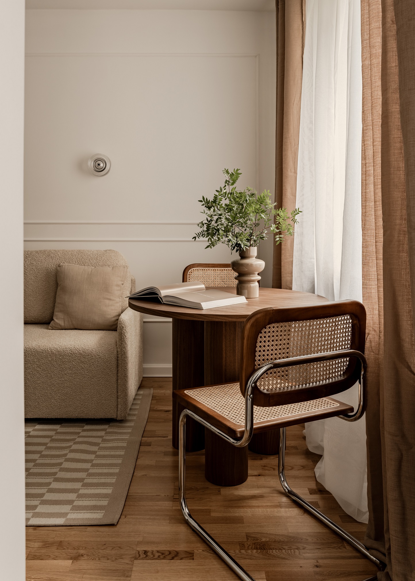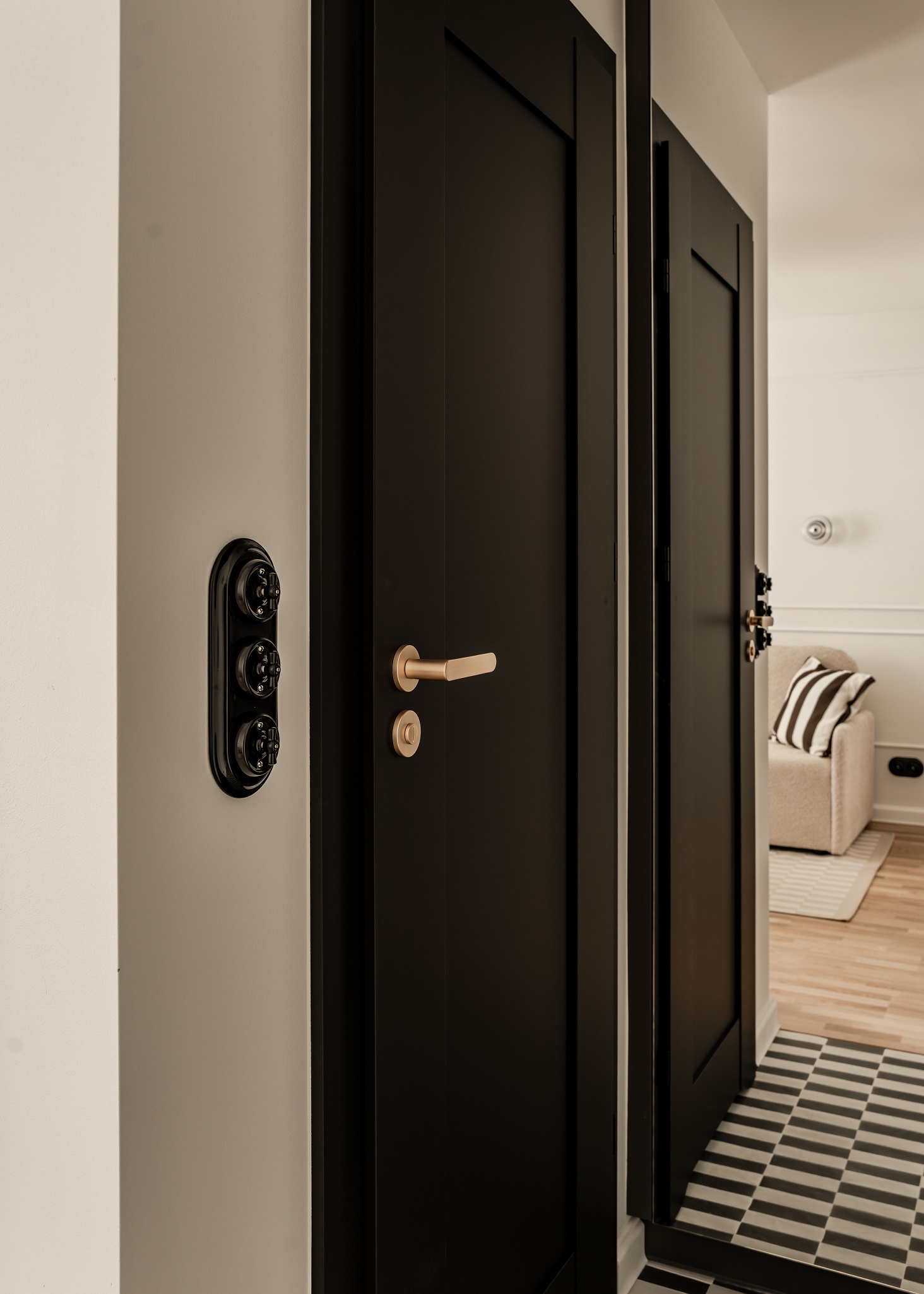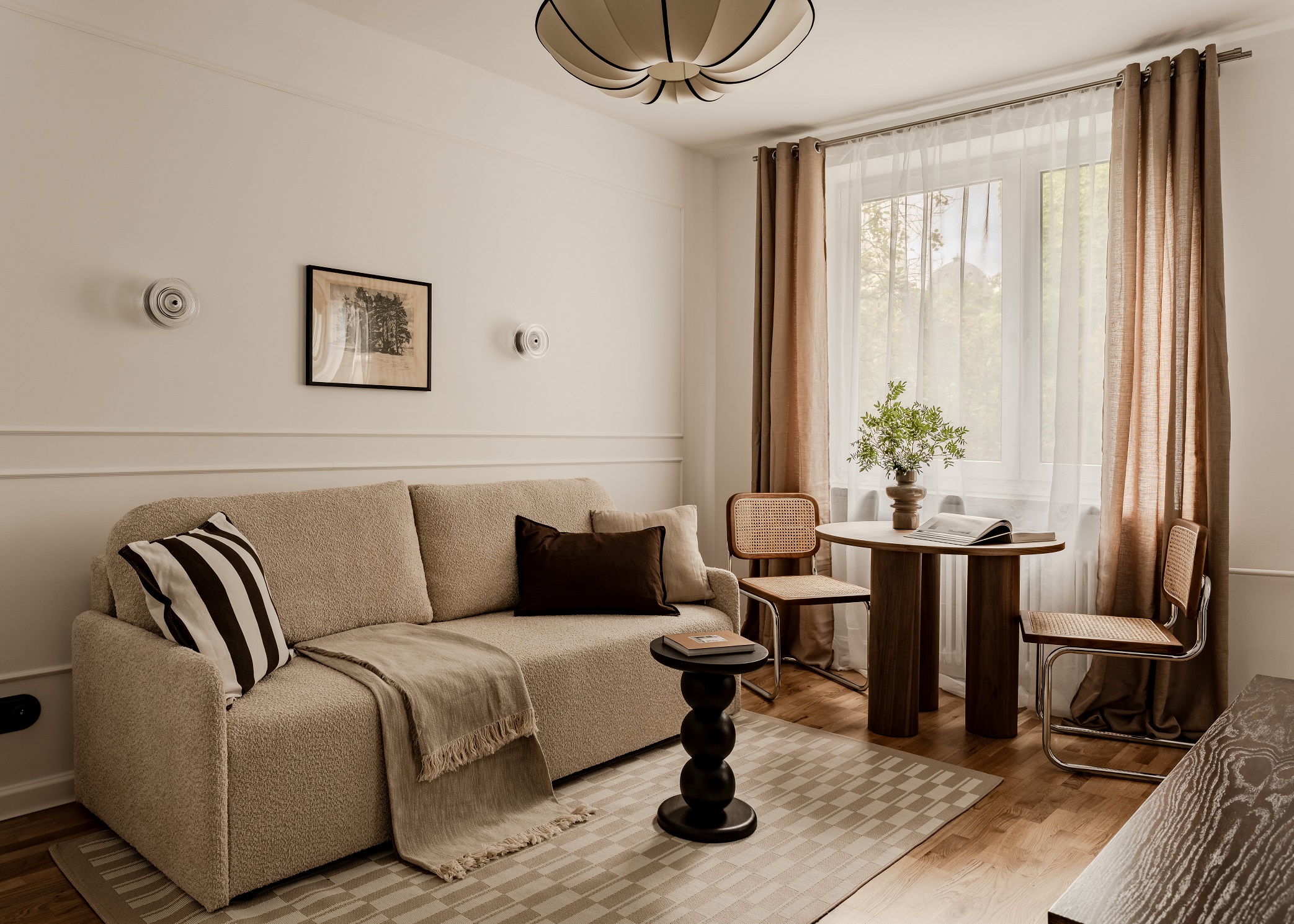 Na podłodze leży dywan z geometrycznym wzorem, powtarzającym motyw z kuchni i przedpokoju. Całość uzupełniają uważnie dobrane dodatki i niemal stuletnia grafika kupione na targu staroci – przedmioty, które nadają wnętrzu indywidualnego charakteru.