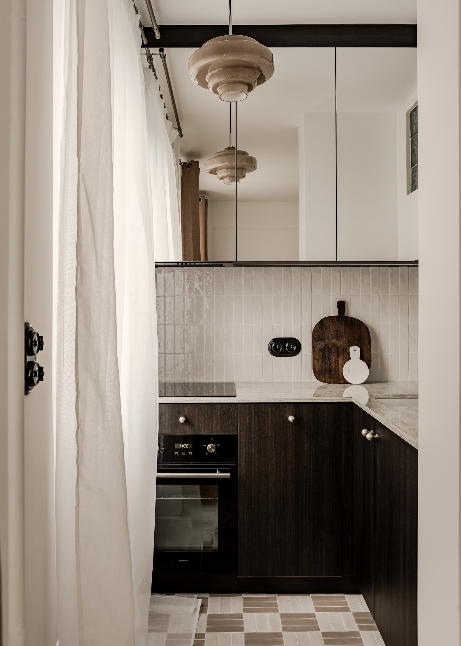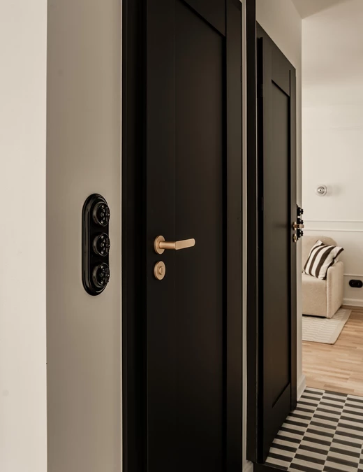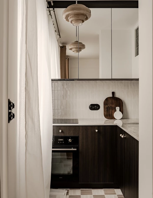 Czarno-biała podłoga w holu o klasycznym, geometrycznym wzorze prowadzi w głąb mieszkania, a lustrzane fronty szafy optycznie powiększają strefę wejściową. Dalej znajdziemy czarne drzwi do łazienki i niewielką kuchnię, w której każdy centymetr został dokładnie zaplanowany, by wykorzystać maksymalnie przestrzeń.