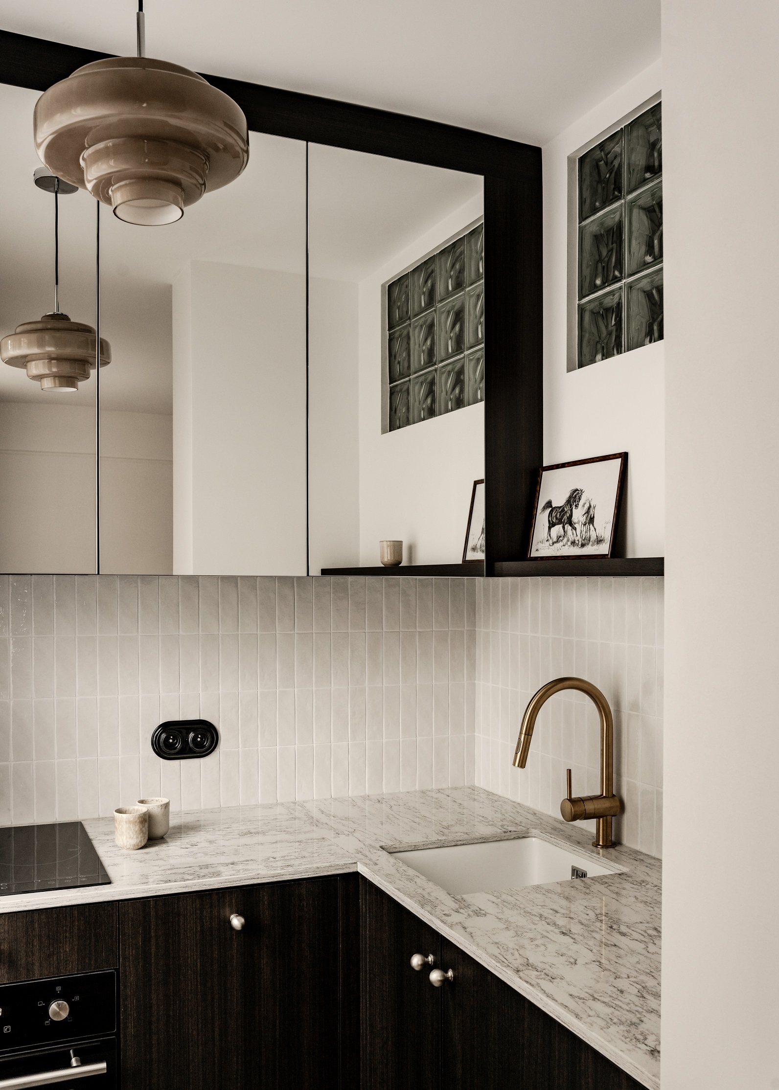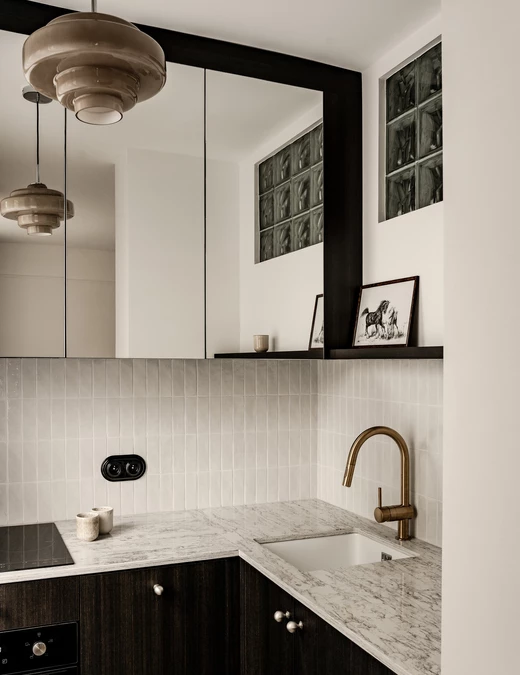 Zastosowano tu płytki Wow Design z kolekcji Rebels, proste ciemne szafki, złotą armaturę i porcelanowy zlew. Projektanci zdecydowali się zachować tu też luksfery, które doświetlają kuchnię i nawiązują do modernistycznego charakteru budynku. To jedyny zachowany oryginalny element wnętrza.