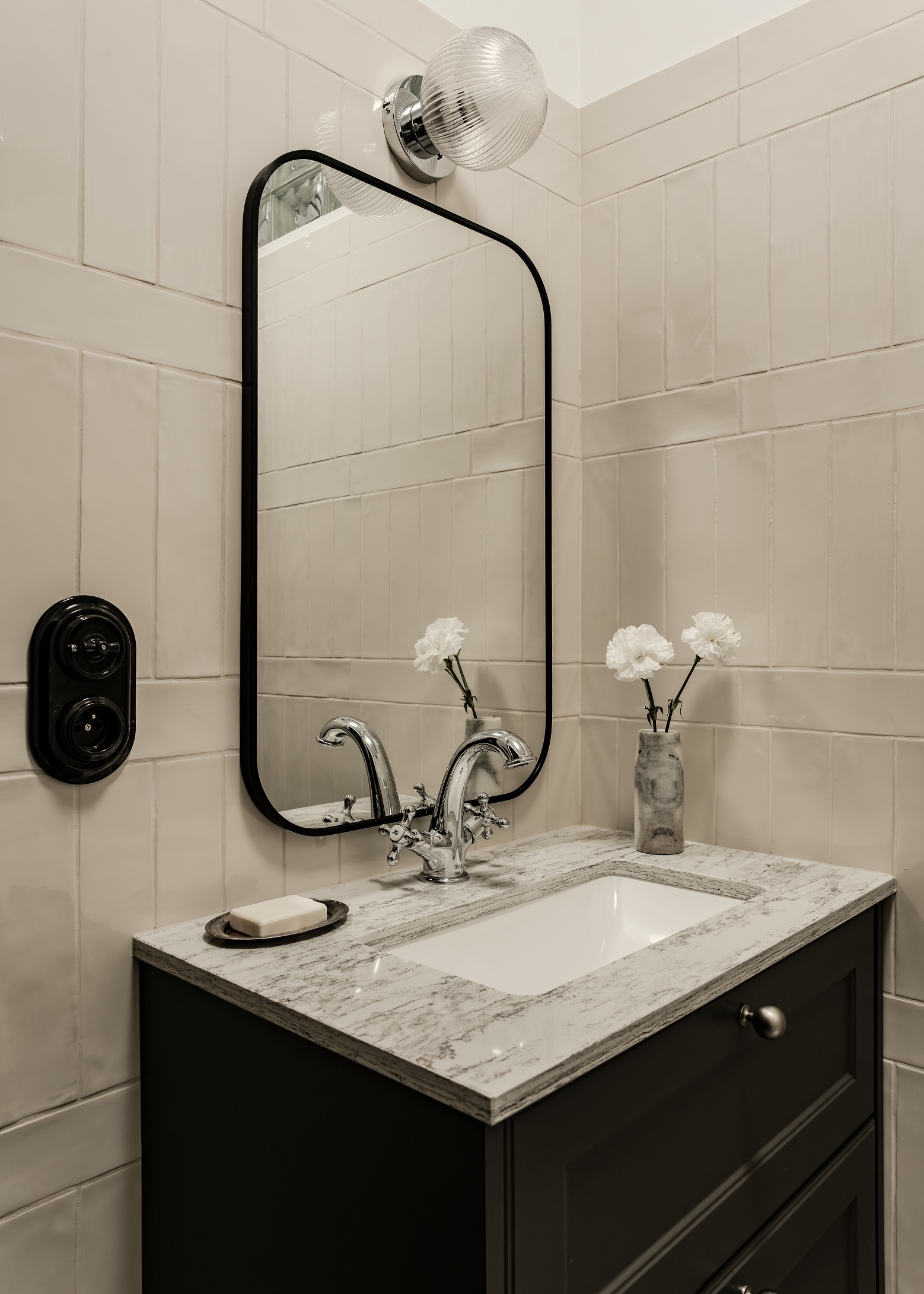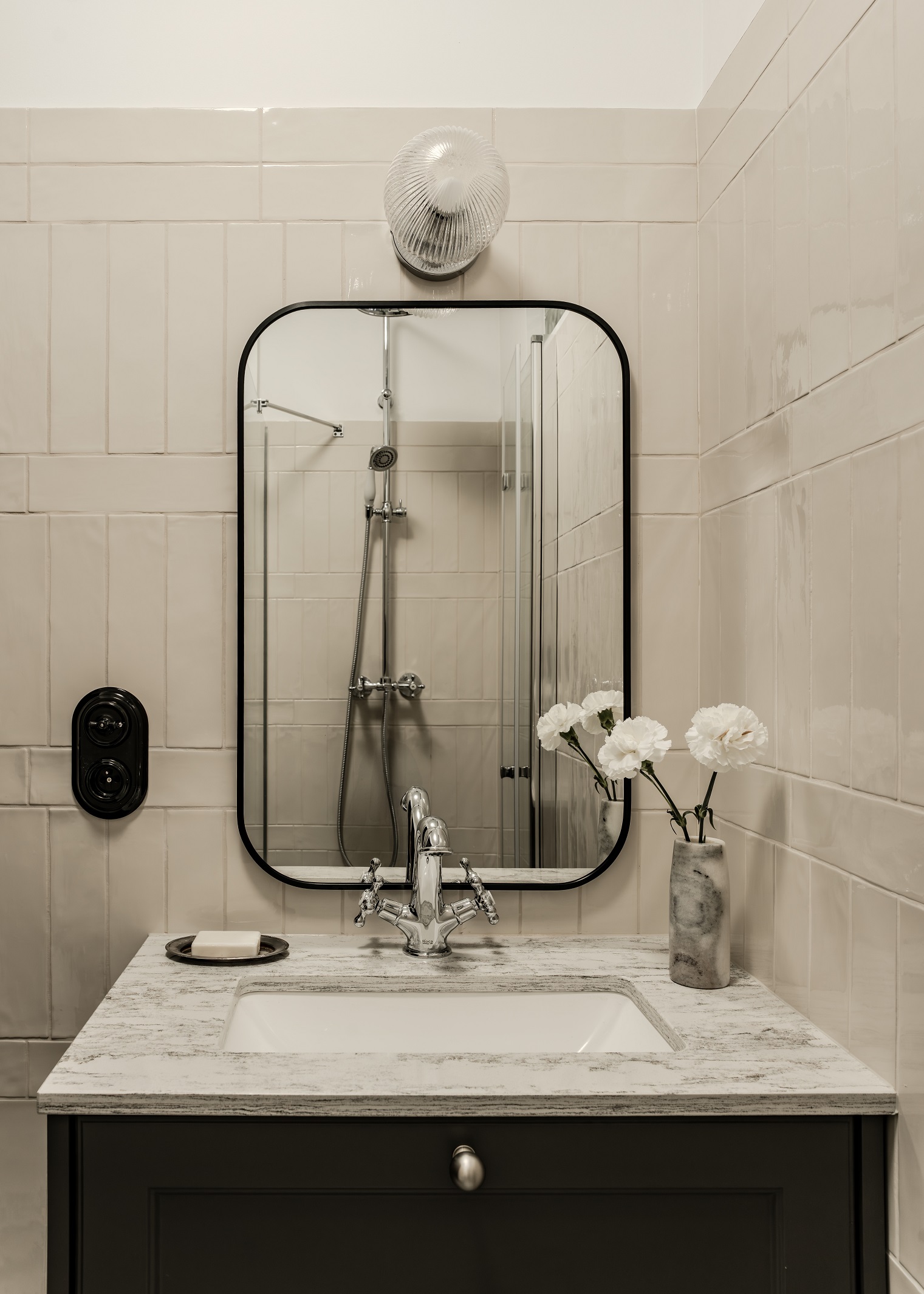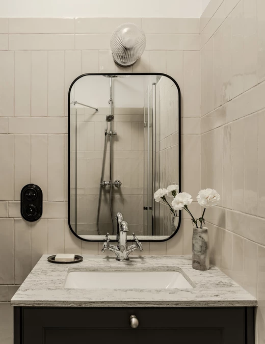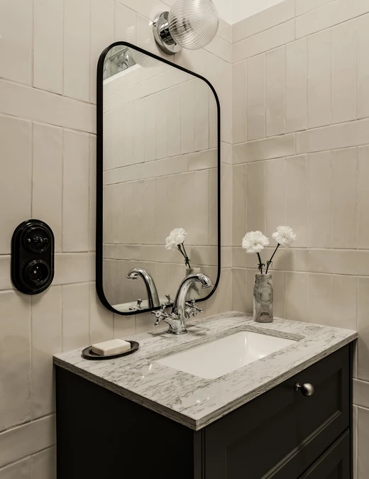 Łazienka, choć niewielka, została zaprojektowana z dużą dbałością o detale. Połączenie bieli, czerni i chromu nadaje jej klasyczny wyraz, a ukryta w zabudowie pralka pozwoliła odzyskać przestrzeń. Lustrzane fronty, obecne również w kuchni, pełnią tu nie tylko funkcję estetyczną, ale przede wszystkim praktyczną – powiększają i rozświetlają małe pomieszczenia.