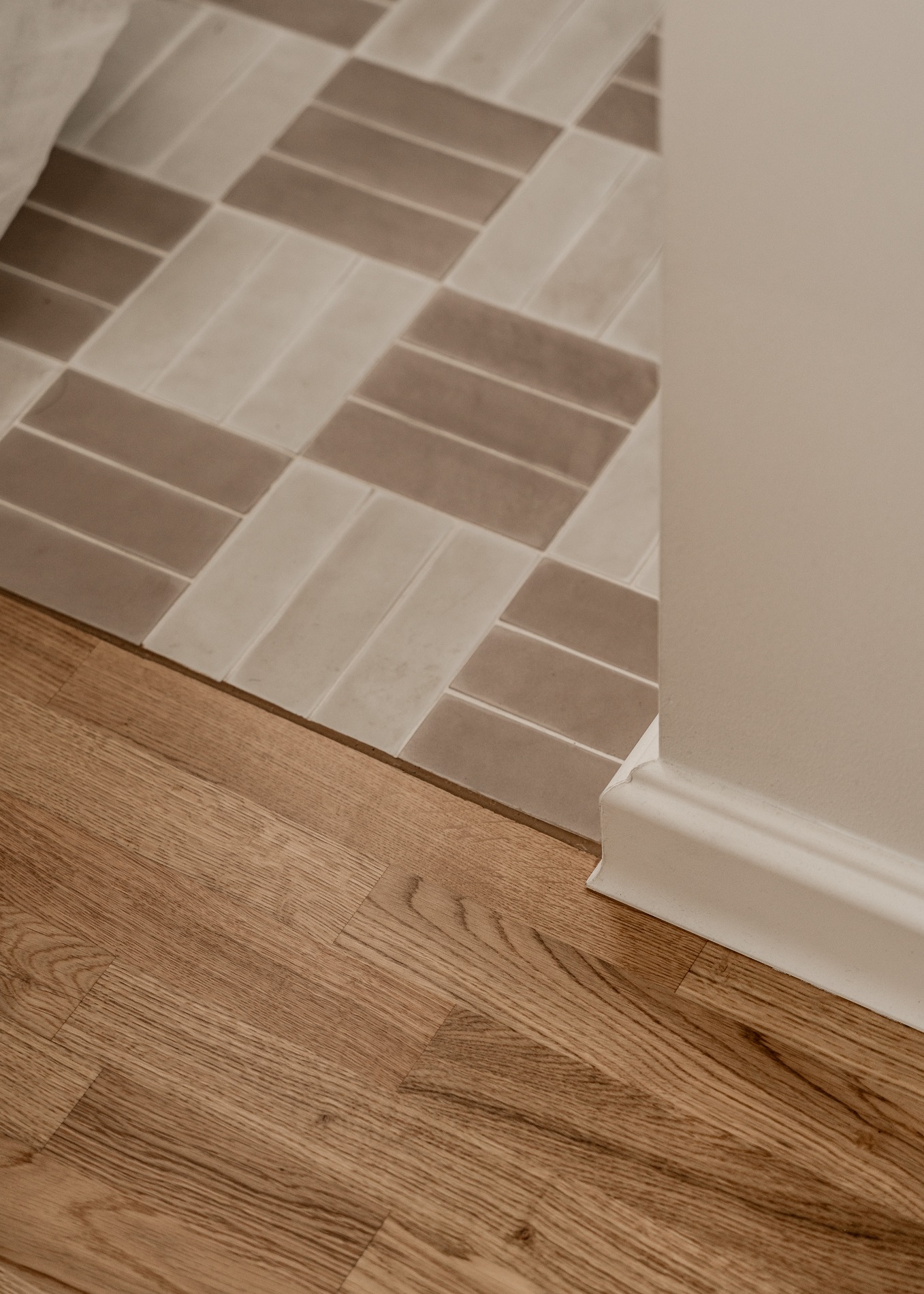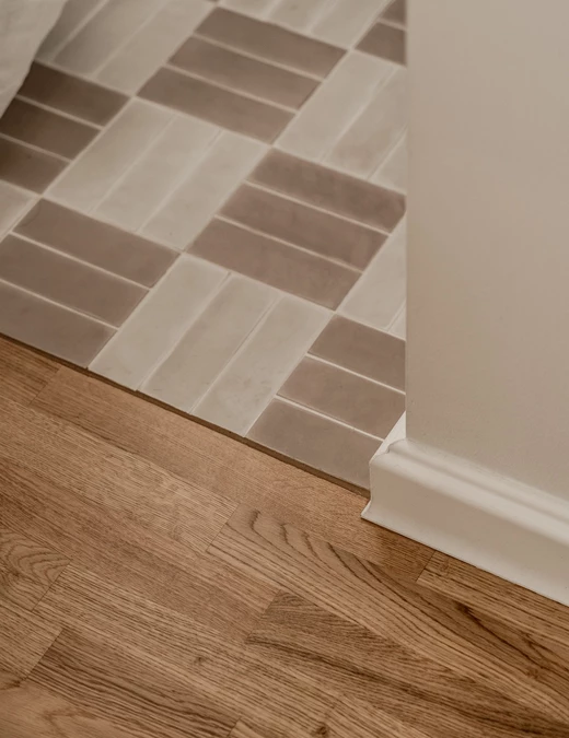 Mały metraż mieszkania wymagał jasnego podziału na strefy. Aby zachować porządek i spójność we wnętrzu zastosowano płytki z jednej kolekcji – w różnych kolorach i układach. Dzięki temu każda część mieszkania, od kuchni po łazienkę, zyskała własny charakter, pozostając częścią harmonijnej całości.