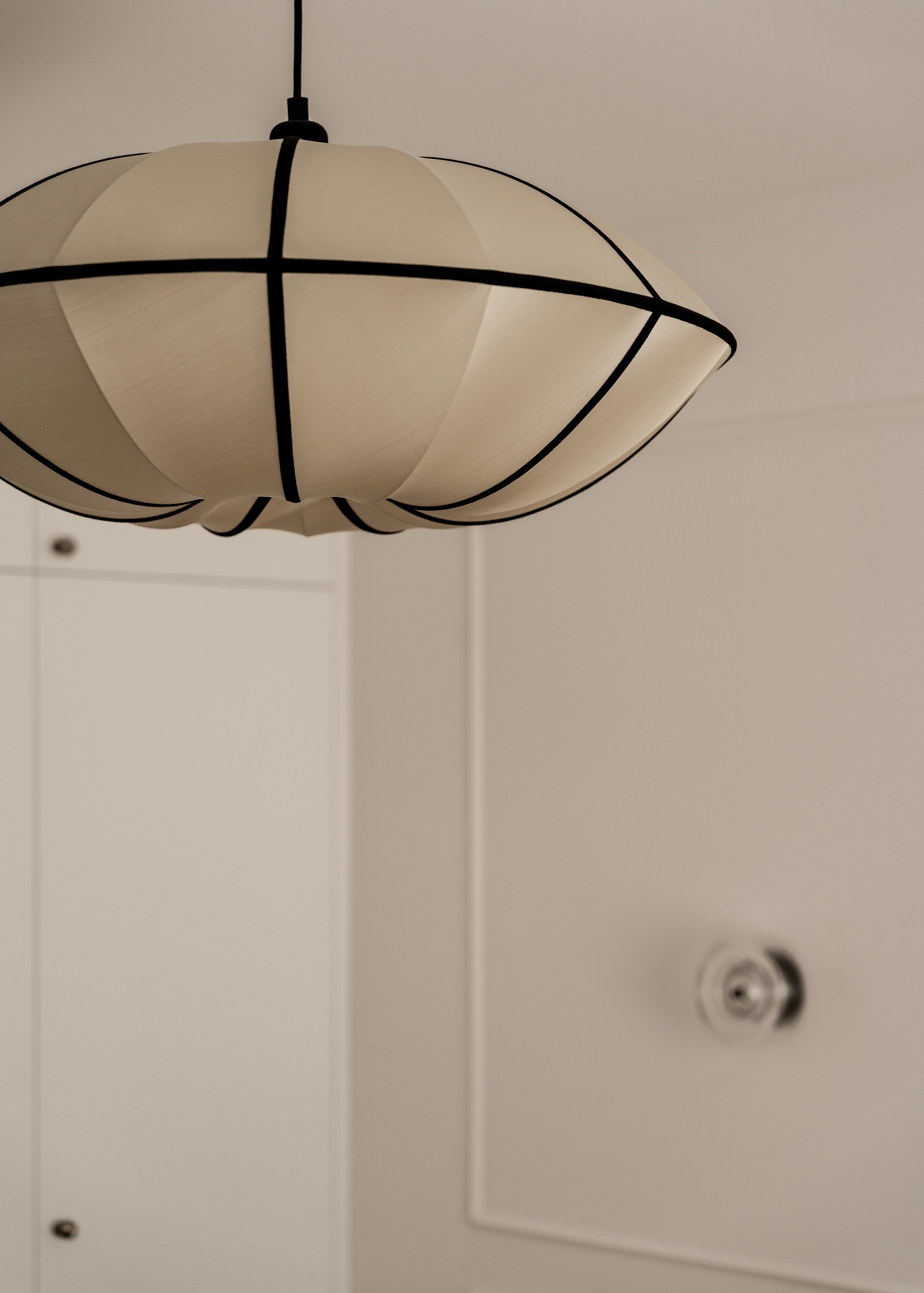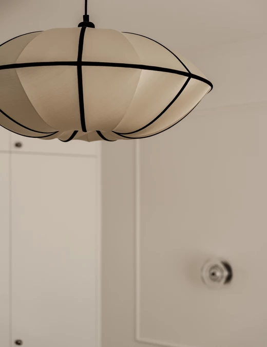 W salonie dominują ciemne meble na tle jasnego parkietu. Delikatna sztukateria i szklane kinkiety nadają mieszkaniu elegancki ton. Centralnym punktem jest lampa Oi Soi Oi – model Ufo, która dobrze współgra z prostotą pozostałych elementów.