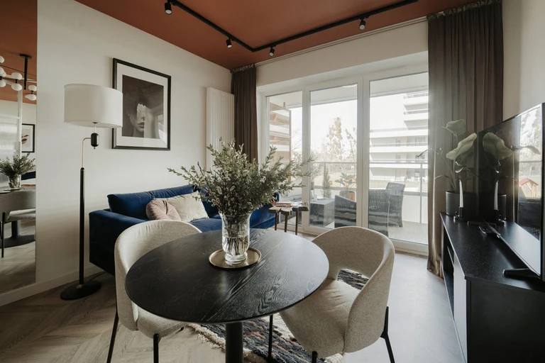 „Od początku zakładaliśmy, że wprowadzimy do tego wnętrza zdecydowany kolor. Wiedzieliśmy też, że nie będą to ściany. Próbowaliśmy różnych wersji kolorystycznych – szary, granatowy, żółty... Ale dopiero elegancki rudy idealnie wpasował się w stylistykę mieszkania. Nadal wnętrzu zupełnie innego wymiaru” – wspomina Mateusz Czeczko. Pozostała kwestia przekonania do tego pomysłu inwestorów. Ku zaskoczeniu architektów, od razu przypadł im do gustu! „Dziś gospodarze śmieją się, że rudy sufit jest punktem wyjścia każdej rozmowy z gośćmi wchodzącymi do mieszkania”.