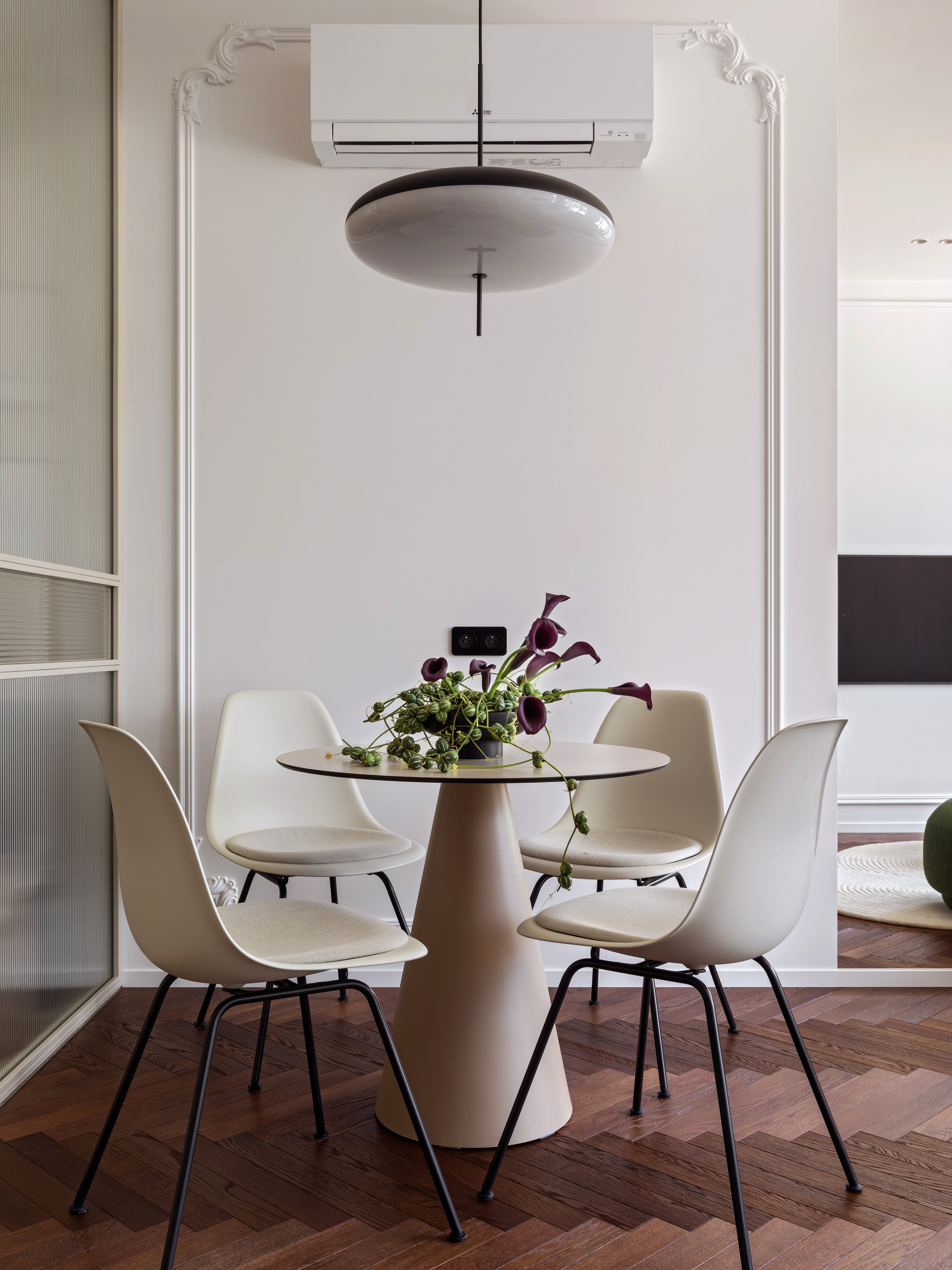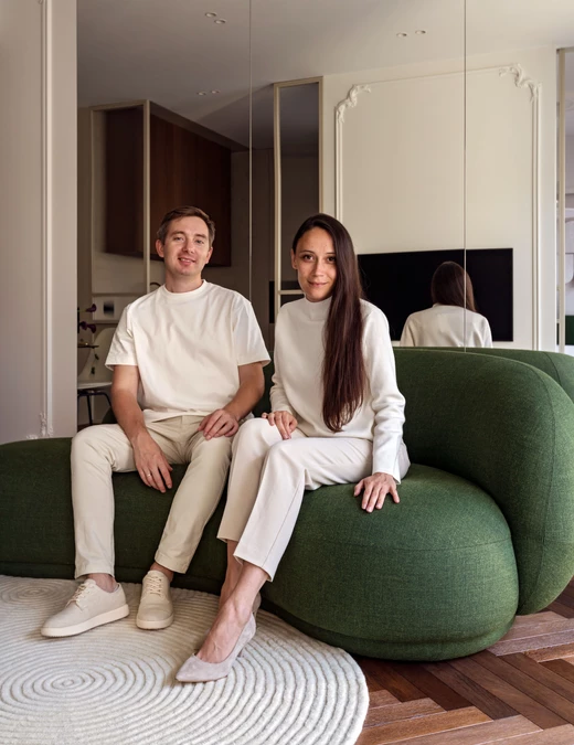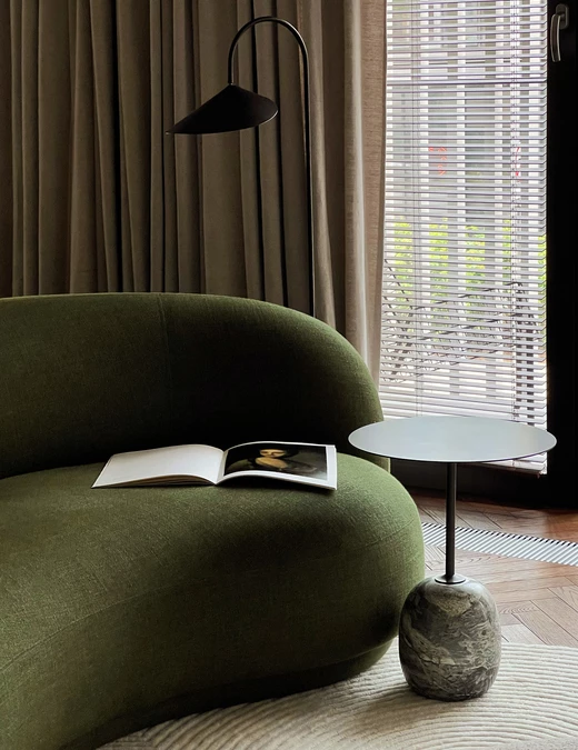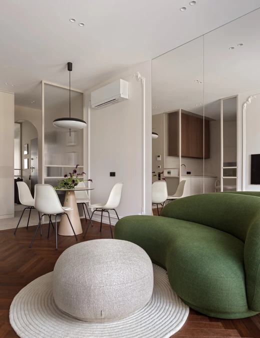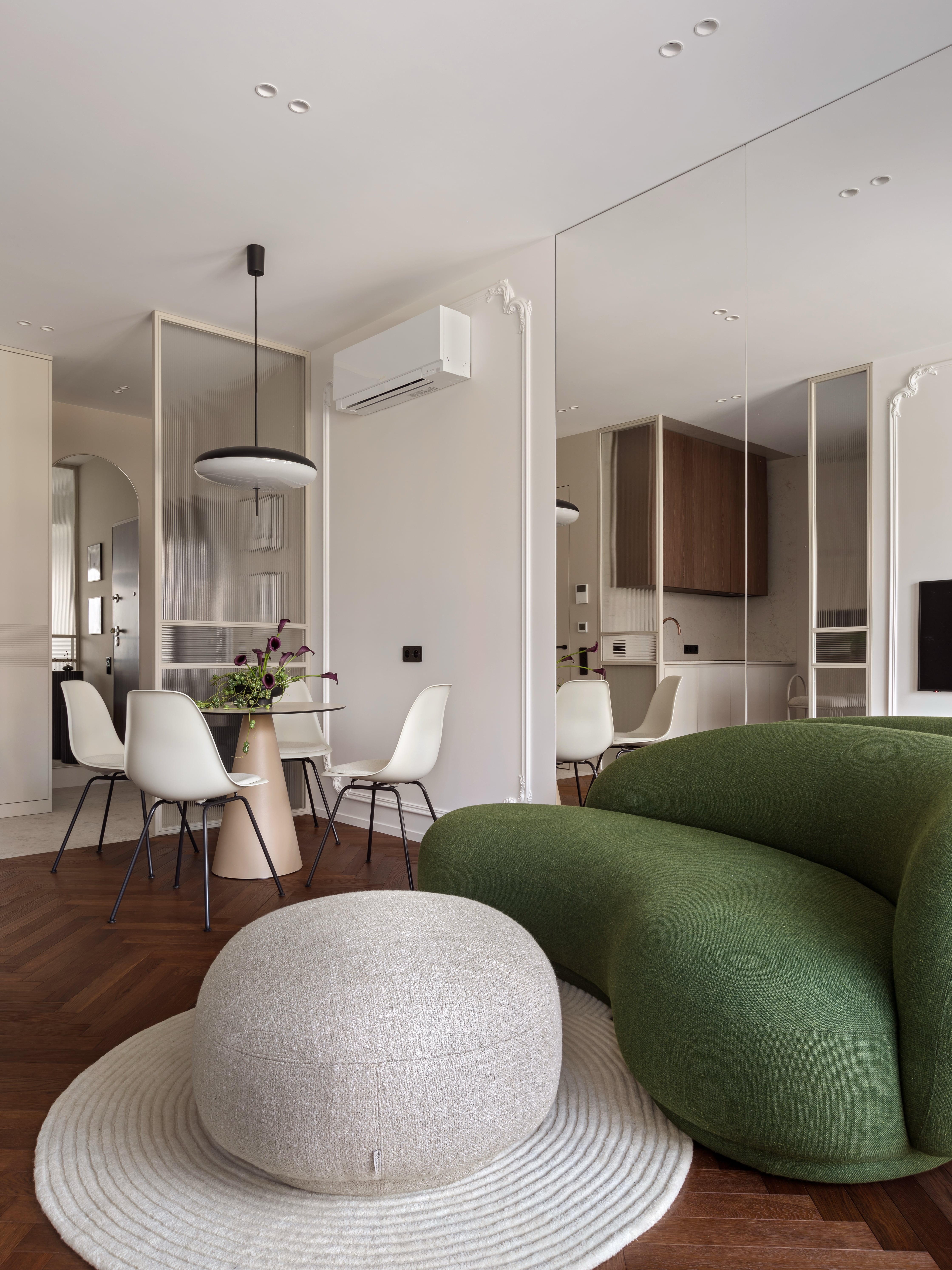 Strefowanie mieszkania odbywa się za pomocą mebli i gry odbić. Przedpokój oddzielono szklaną ścianką, która zasłania jadalnię przed wzrokiem osób wchodzących, zachowując jednocześnie dopływ światła i nutę tajemnicy. Centrum części dziennej stanowi zielona, owalna sofa uzupełniona dywanem o fakturalnym wzorze, który nawiązuje do rytmu szklanych podziałów. W kuchni wykorzystano fornir orzechowy, który ociepla jasną paletę wnętrza, a przy szklanej przegrodzie zorganizowano niewielki barek dla dwóch osób.