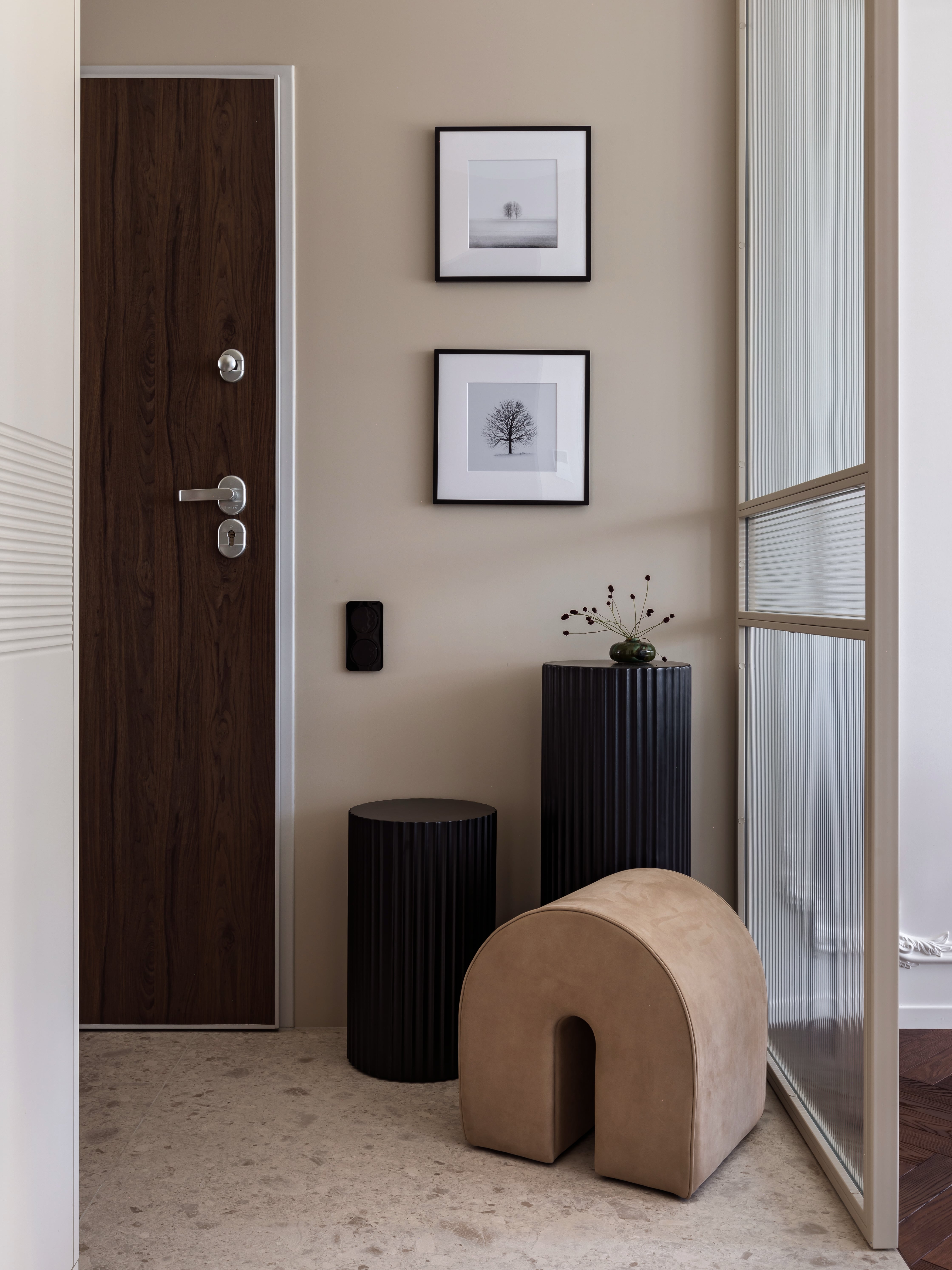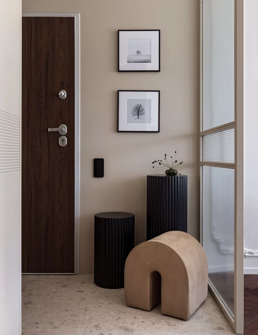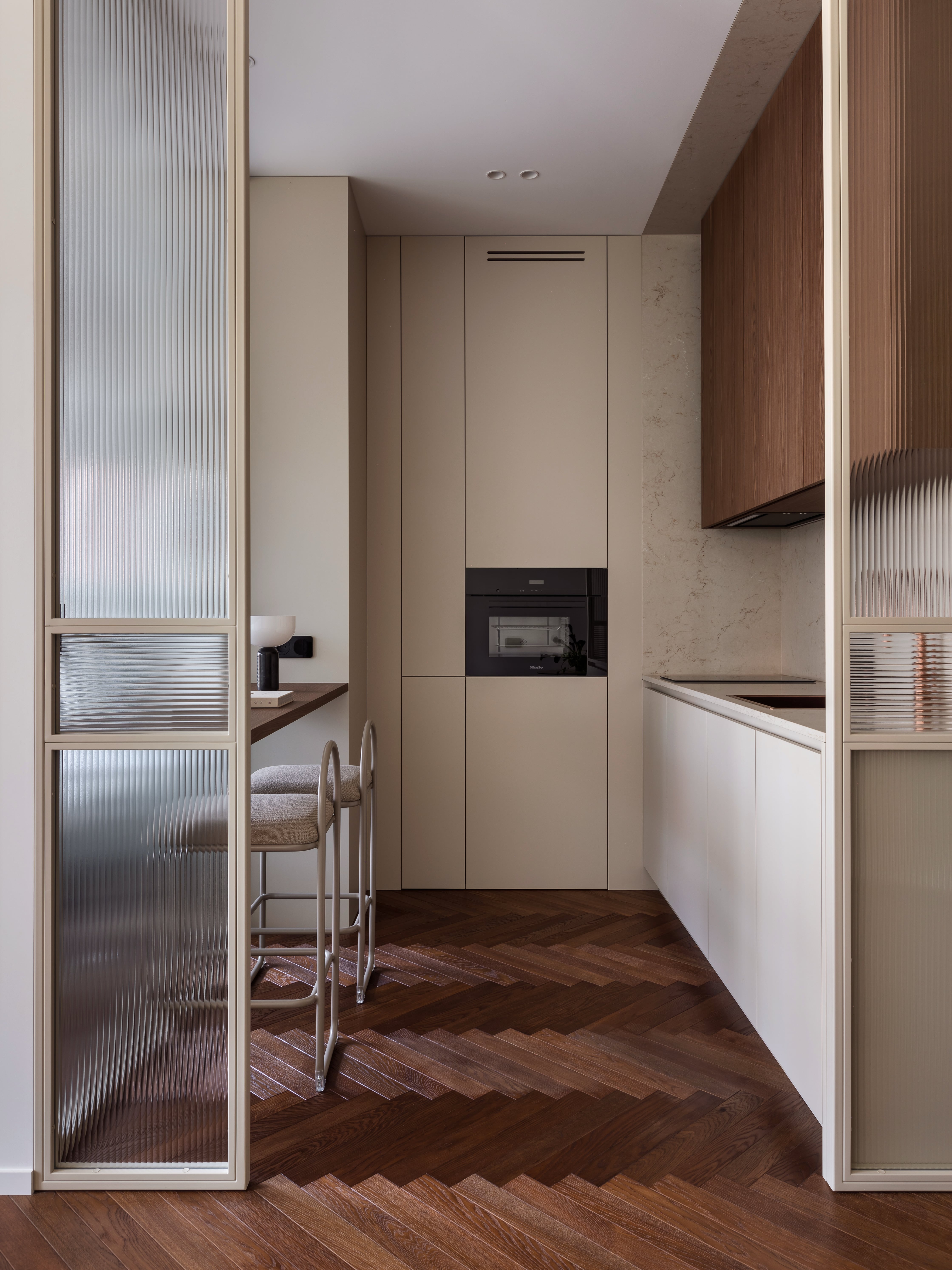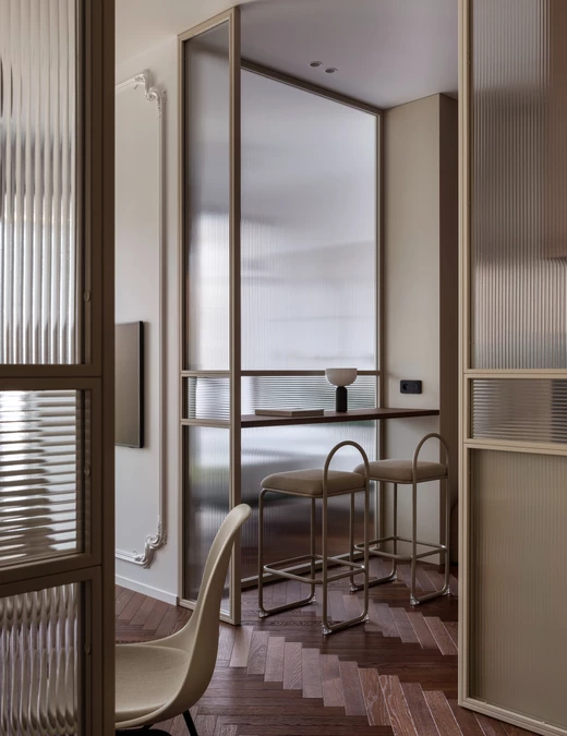 Zamiast tradycyjnych ścian działowych, projektanci postawili na strukturę opartą na świetle i osiach widokowych. Zastosowano ryflowane przeszklenia oraz lustrzaną ścianę za sofą, która optycznie podwaja głębię salonu i potęguje dostęp światła dziennego, co jest istotne ze względu na północną ekspozycję okien. Wzrok swobodnie przemieszcza się od wejścia aż po sypialnię, napotykając jedynie lekkie podziały, które separują poszczególne funkcje, ale nie zamykają przestrzeni.
