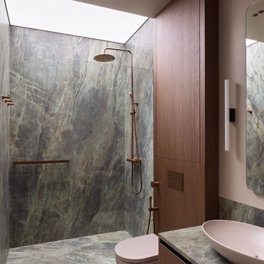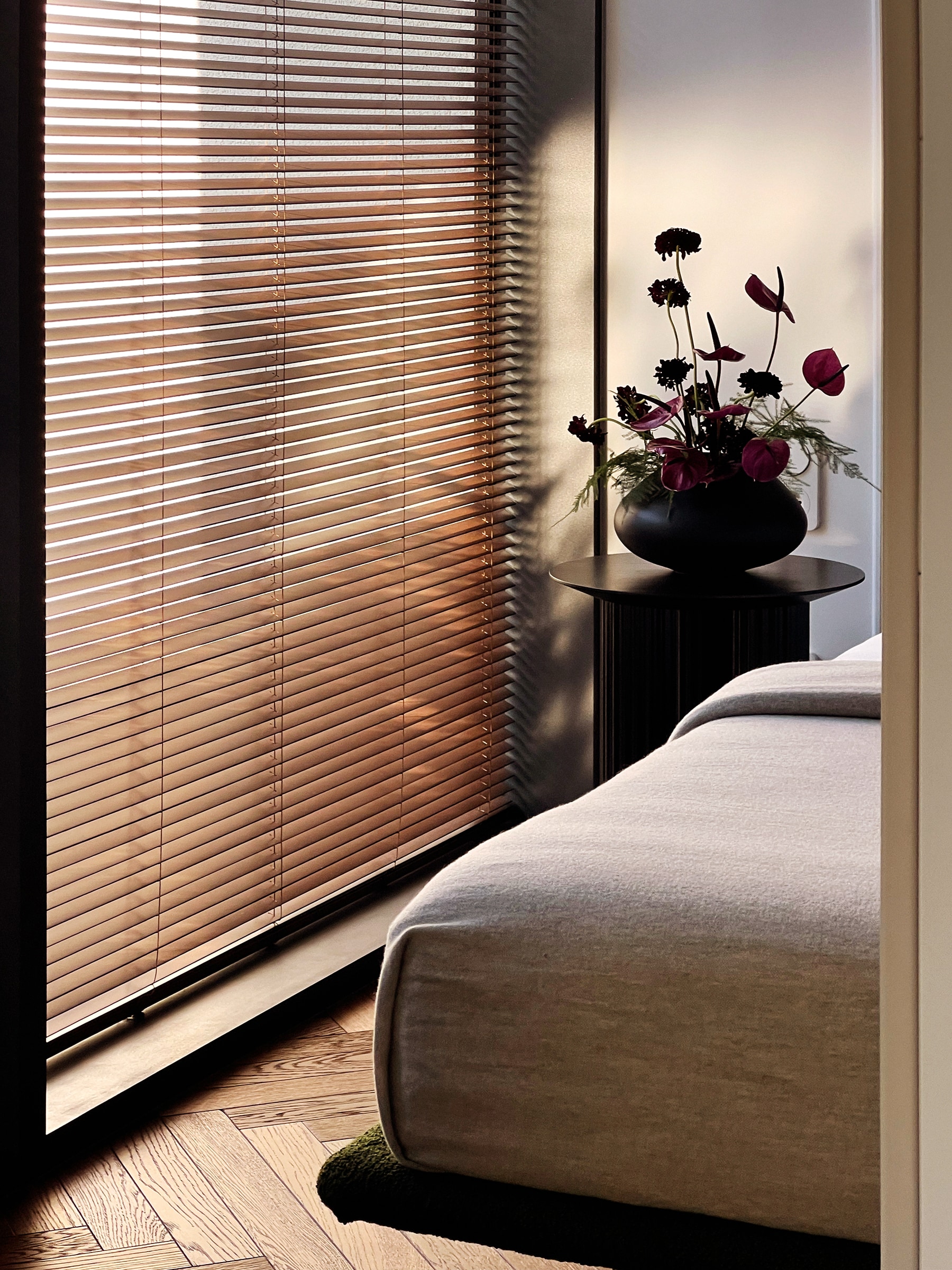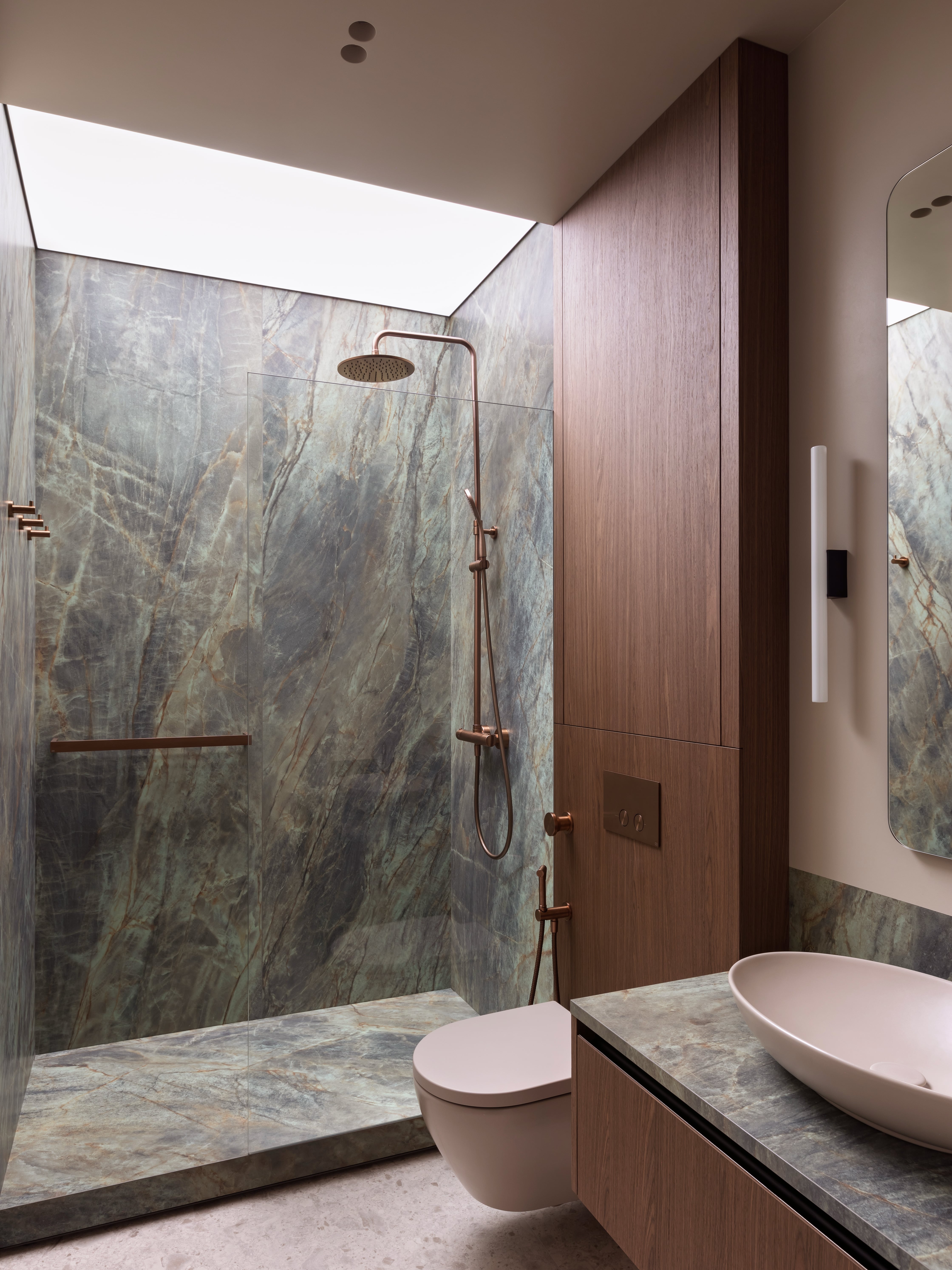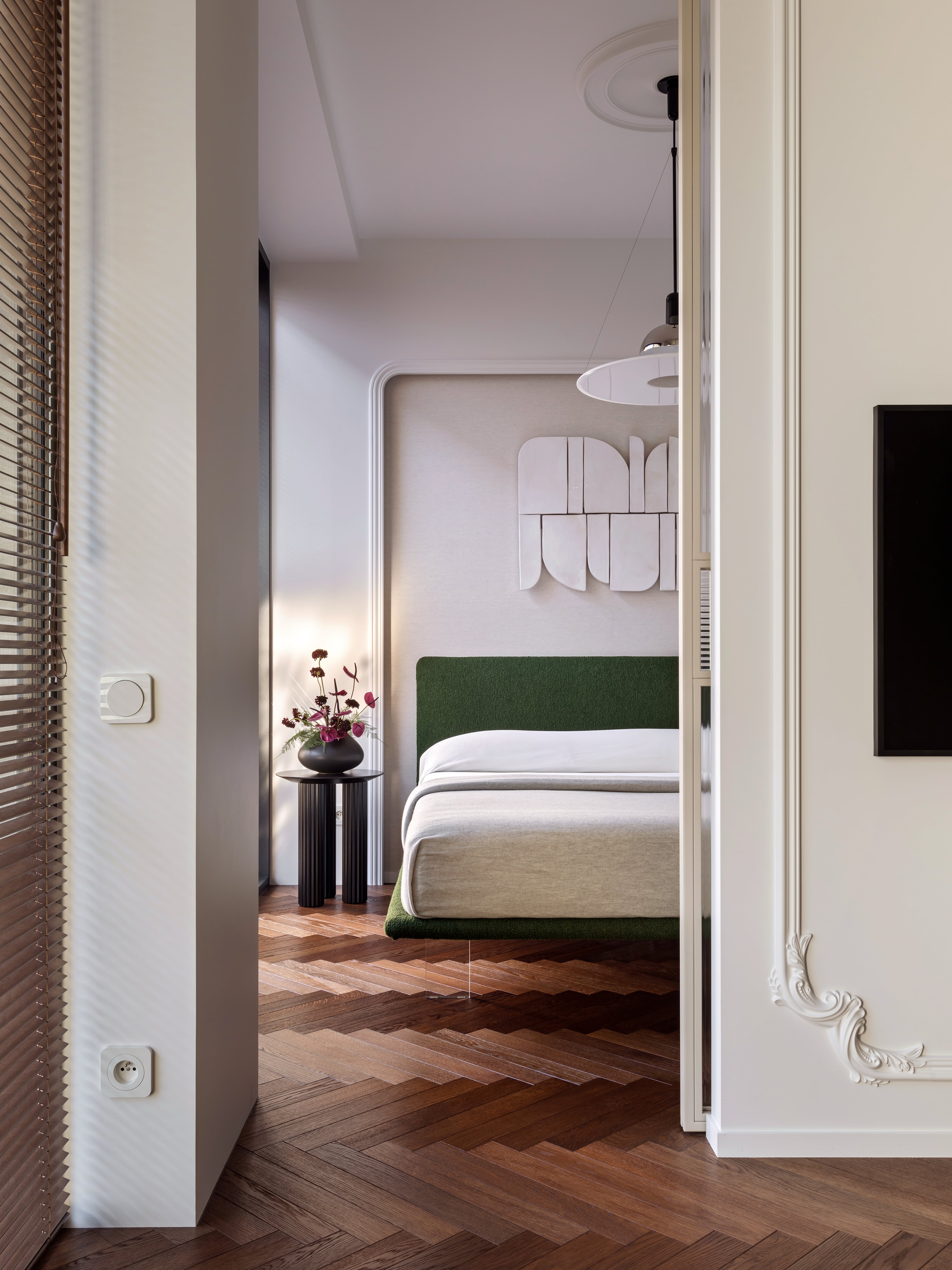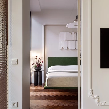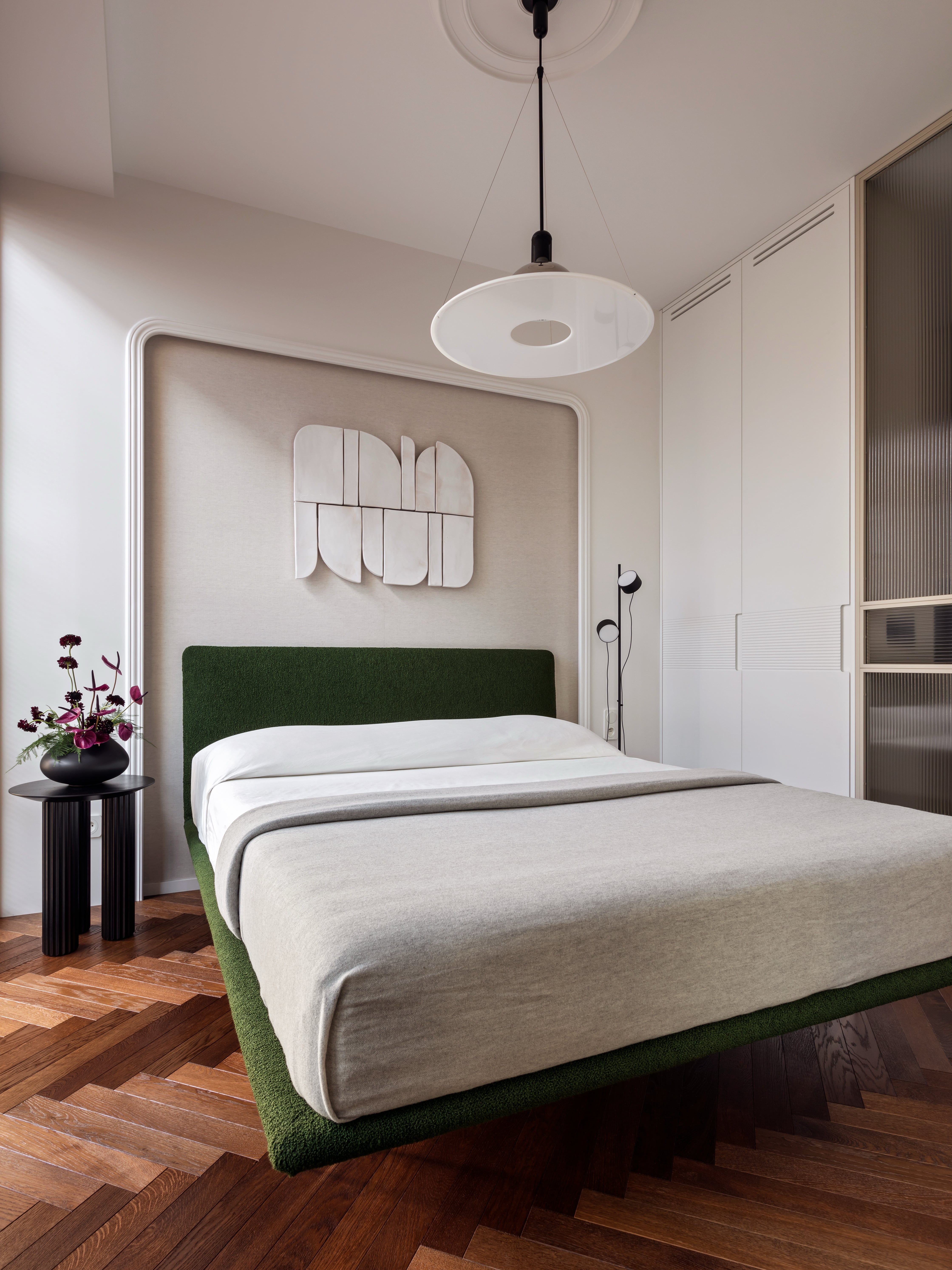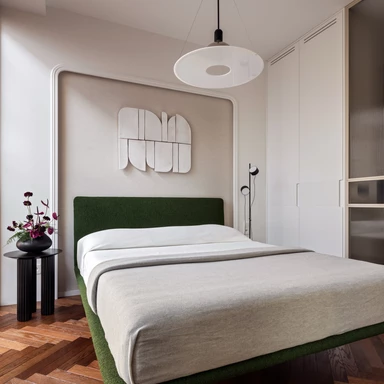 Wbrew częstej praktyce chowania łóżka w ciemnych niszach, sypialnię umieszczono bezpośrednio przy oknie. Dzięki przesuwnej, szklanej ścianie można ją oddzielić od reszty mieszkania lub pozostawić otwartą, co płynnie łączy ją z salonem. Wrażenie lekkości potęguje łóżko na szklanych nogach, które wydaje się lewitować nad podłogą, oraz przejrzyste szkło wpuszczające światło do kuchni. Łazienkę zaprojektowano w stonowanych barwach ziemi, łącząc głęboką zieleń z ciepłym beżem i fakturalnym drewnem. Specjalnie podświetlony sufit nad prysznicem imituje efekt światła dziennego, co wizualnie podwyższa to pomieszczenie.