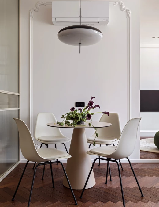 Precyzyjnie zaplanowany układ i konsekwencja materiałowa sprawiły, że mieszkanie wydaje się znacznie większe niż wynika to z jego rzeczywistych wymiarów. Dzięki świadomemu operowaniu odbiciami i przezroczystościami udało się stworzyć miejsce, które nie ogranicza mieszkańców, lecz otwiera przed nimi funkcjonalną i jasną przestrzeń do życia.