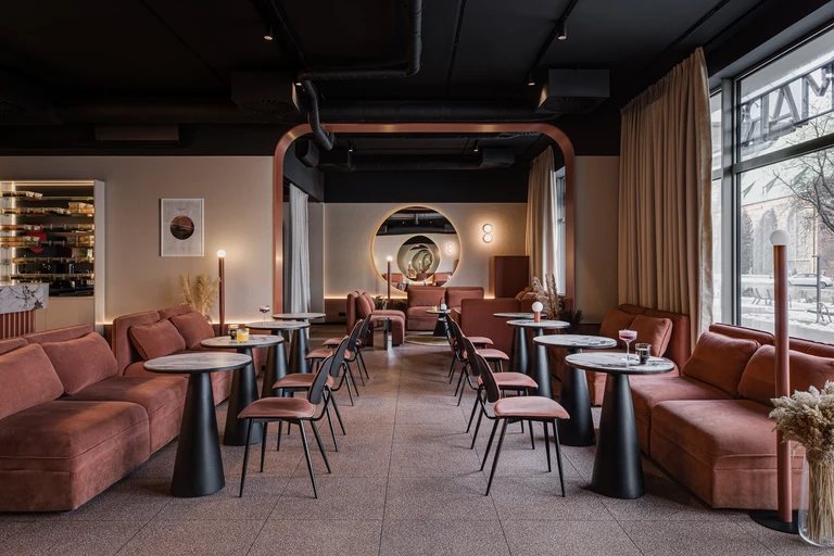 „Na dwóch przeciwległych ścianach lokalu umiejscowiliśmy dwa okrągłe, podświetlane lustra. Te unoszące się jak na niebie obiekty przypominają inne planety lub księżyce widzianych z powierzchni Marsa” – opowiada Michał Raca. W lokalu pojawiły się również meble o nietypowych formach, takie jak stoły o stożkowych podstawach czy stojące lampy wykonane z rury w kolorze ceglanym i białego klosza. Oba elementy wykonano według projektu pracowni Raca Studio.