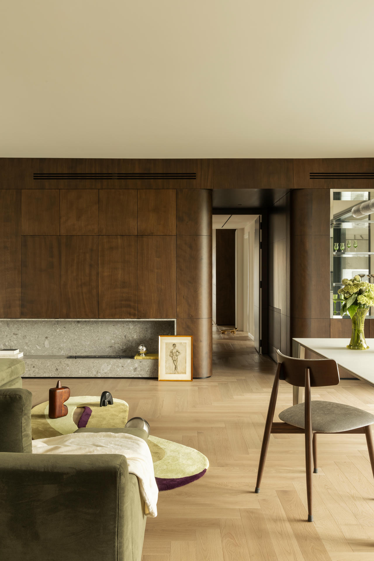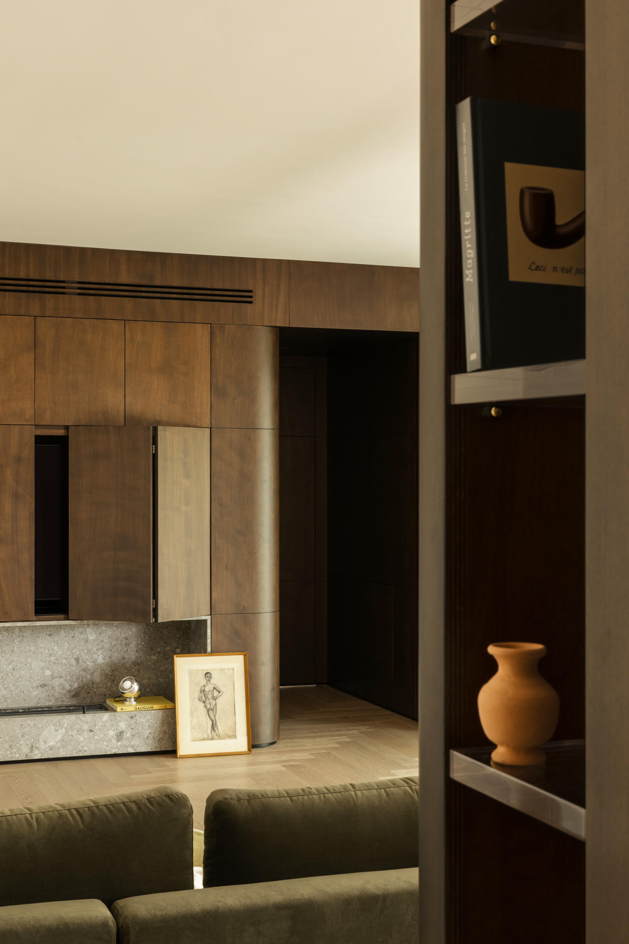 Zabudowy – szafy, schowki oraz elementy wyposażenia – zostały zaprojektowane i wykonane na zamówienie, co pozwoliło zachować estetyczną czystość i spójność. Kompozycję dopełniają współczesne detale: półki z pleksiglasu w barku, lampa Flos nad stołem w jadalni oraz chromowane kinkiety Tom Dixon nad sofą.