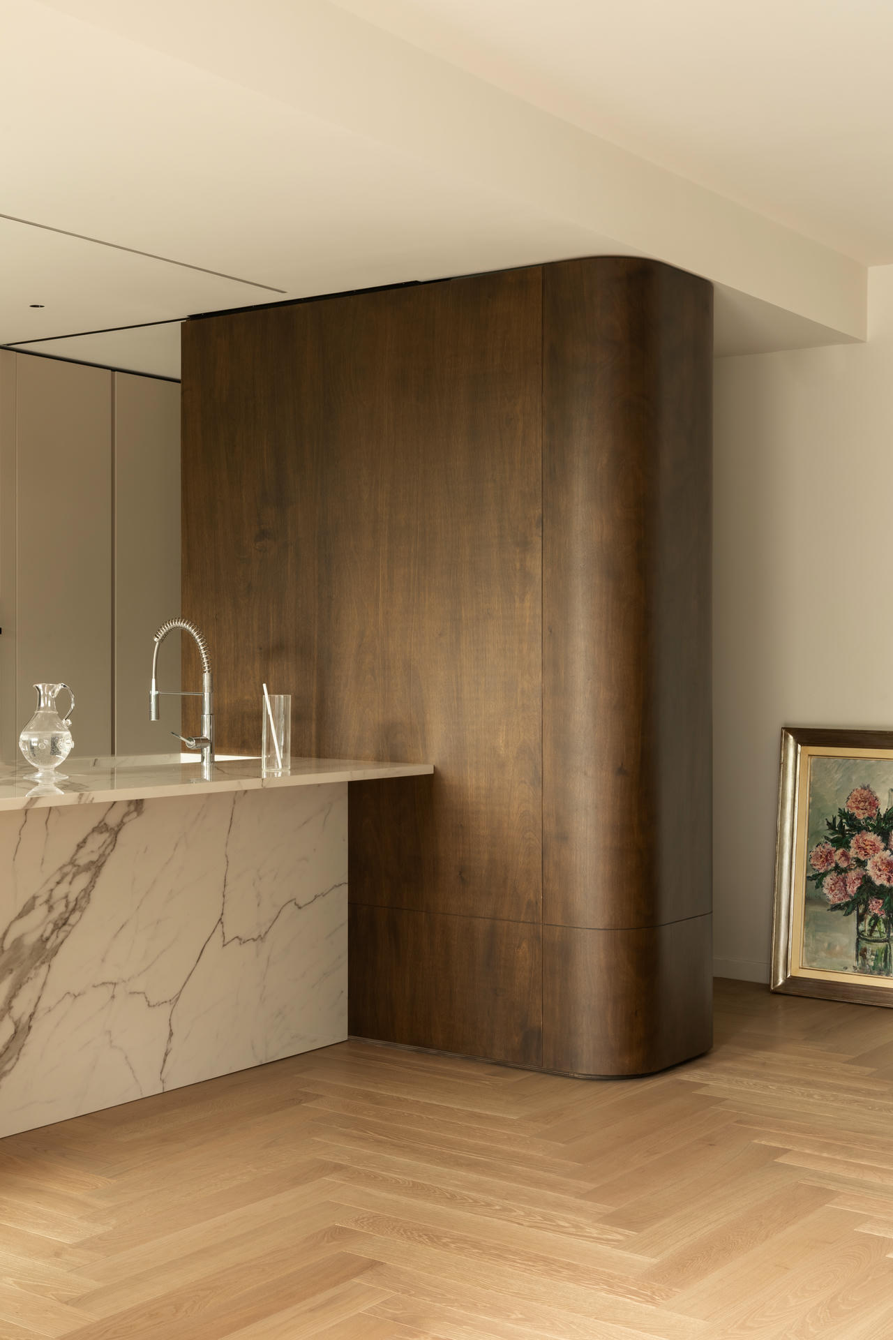 Starannie dobrane materiały są sercem tego projektu. Dwa zakrzywione moduły z ciemnego drewna narzucają rytm i porządek przestrzeni, jednocześnie ukrywając przejścia. Ich szlachetna tonacja kontrastuje z jasnym, dębowym parkietem ułożonym w jodełkę, który wnosi ciepło i buduje wizualną ciągłość.