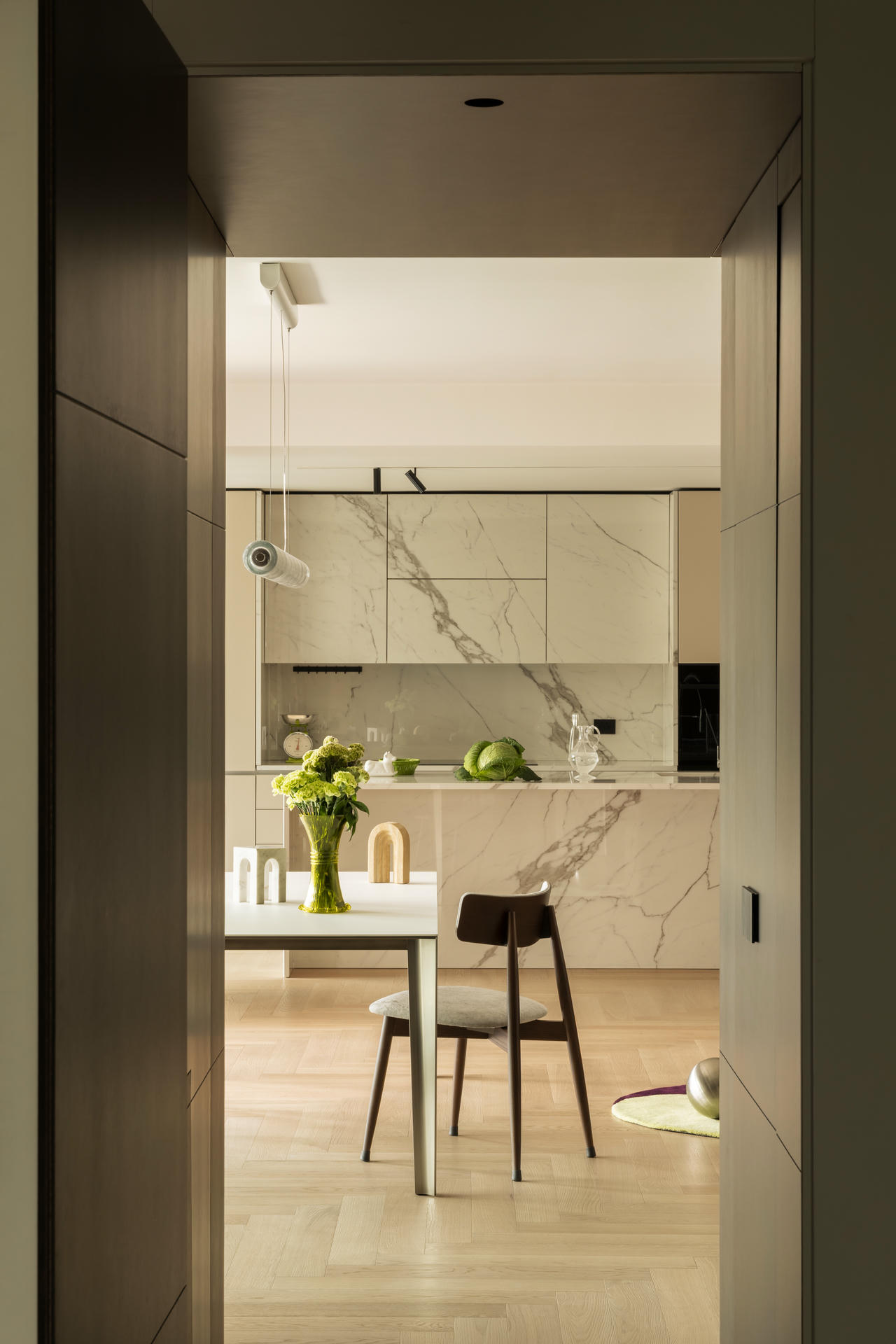 Apartament został czytelnie podzielony na strefę dzienną i nocną, a wnętrza otwarto na otaczającą zieleń. Część dzienna to rozległa, płynna przestrzeń z salonem, jadalnią i kuchnią funkcjonującymi jako spójna całość. Taras stał się bezpośrednim przedłużeniem wnętrza.