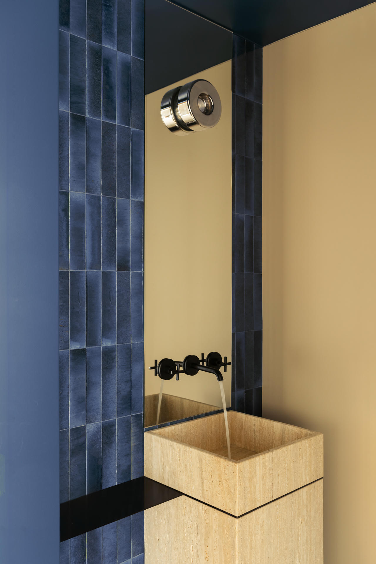 W łazience dla gości połączono głęboki odcień płytek China blue z jasną umywalką wykonaną z trawertynu. Ten wyrazisty, nieoczywisty kontrast stanowi mocny akcent i domyka narrację elegancji oraz zaskoczenia, konsekwentnie zastosowaną w całym projekcie.