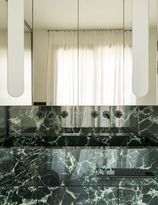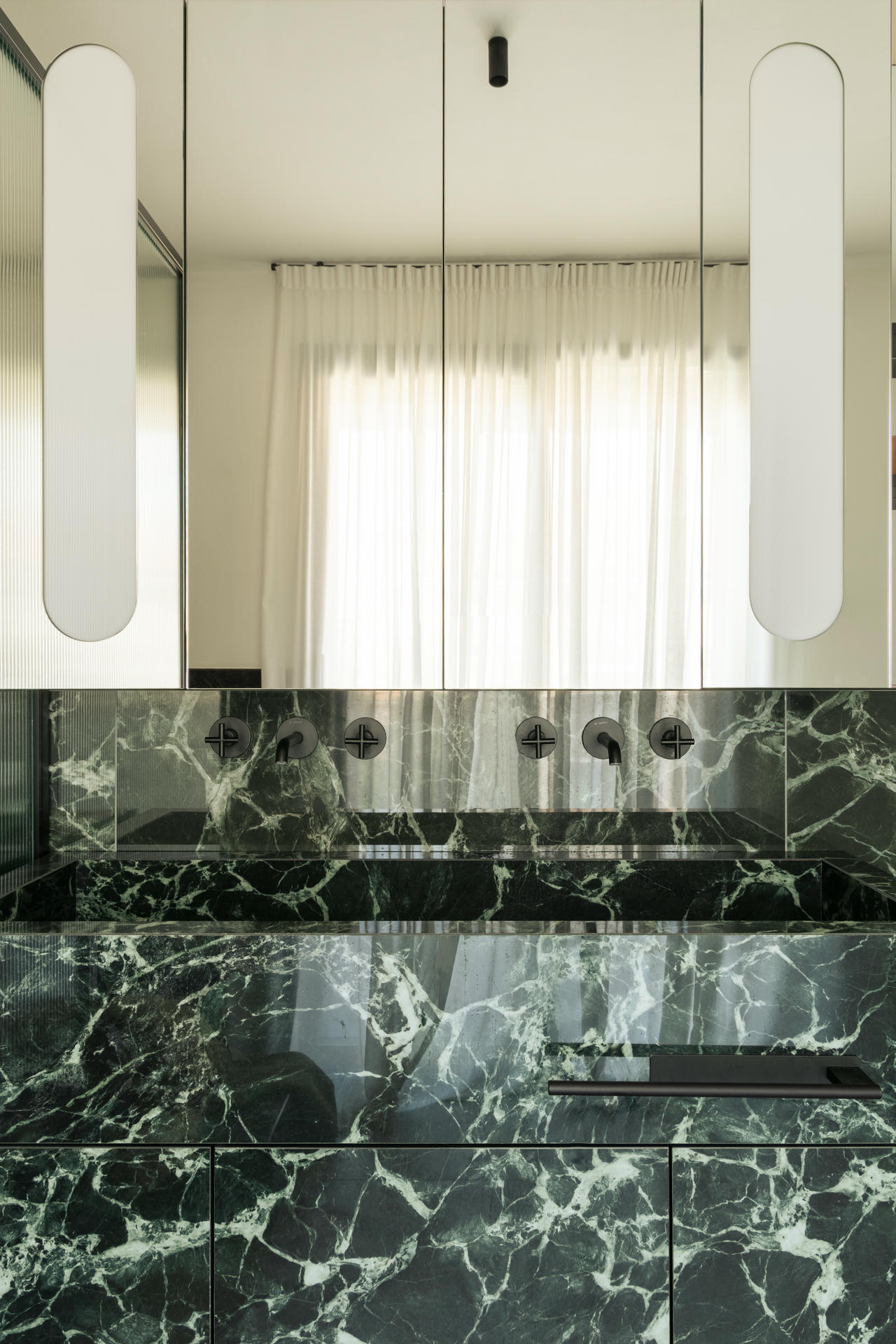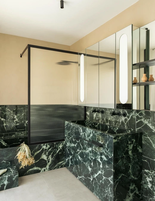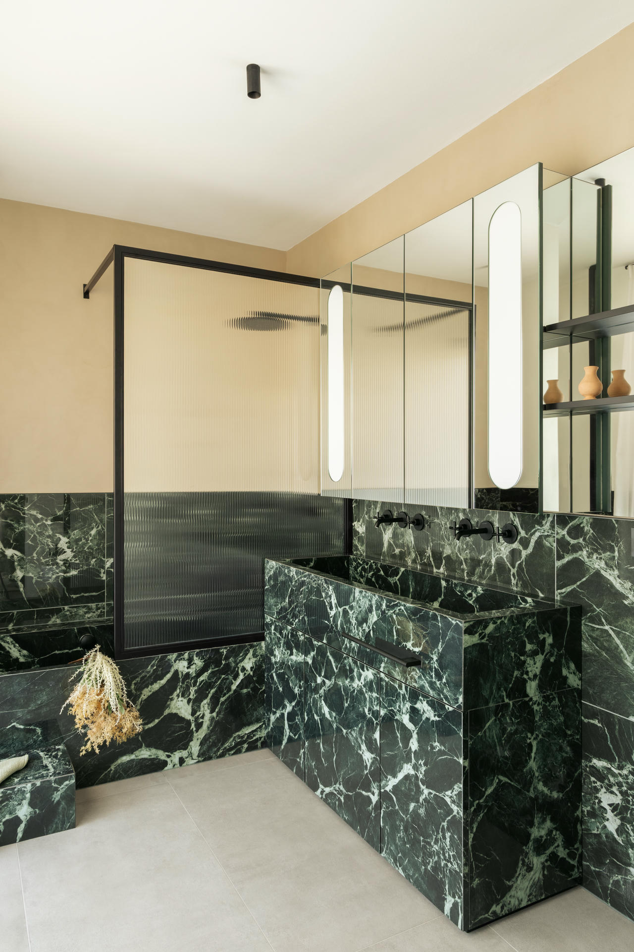 Drzwi z ryflowanego szkła prowadzą do łazienki zrealizowanej w całości w zielonym marmurze Alps. Ten sam kamień zastosowano w meblach, obudowie wanny i okładzinach ścian, tworząc spójną, elegancką kompozycję. Uzupełniają ją beżowe ściany i organiczne linie lamp wbudowanych w lustro.
