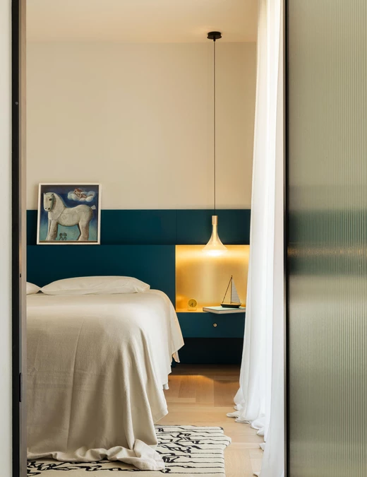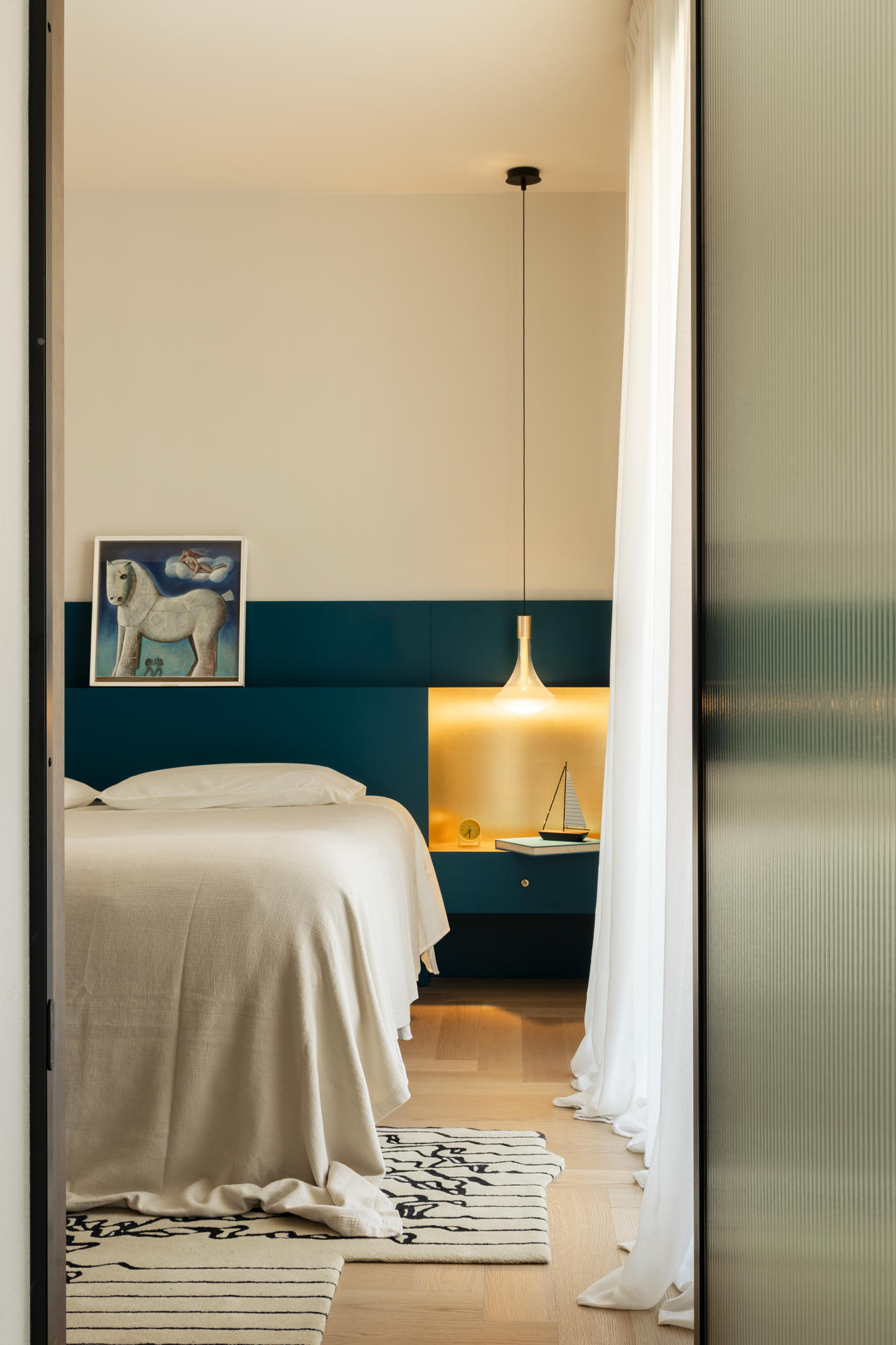 Strefa nocna wyróżnia się odważniejszą kolorystyką i lśniącymi materiałami. W sypialni głównej ściana za łóżkiem została wykończona niebieską, lakierowaną boazerią z zaokrąglonymi niszami z naturalnego mosiądzu. Lampy wiszące Davide Groppi dodają przestrzeni finezyjnej lekkości.