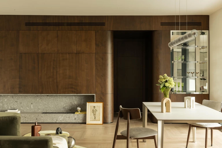 W apartamencie TN7, zaprojektowanym przez Studio Latino, materiały odgrywają pierwszoplanową rolę. To właśnie ich świadomie dobrana paleta – od ciemnego drewna po szlachetne kamienie – stała się punktem wyjścia dla stworzenia 120-metrowej przestrzeni, w której funkcjonalność spotyka się z rzeźbiarską elegancją.