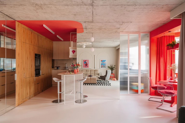 Projektanci z pracowni Estimental zainspirowali się estetyką Memphis, sięgając po geometryczne formy i intensywne barwy. Kolor w tym wnętrzu nie dominuje jednak przestrzeni – pełni raczej rolę subtelnego akcentu, który podkreśla funkcjonalny podział na strefy.