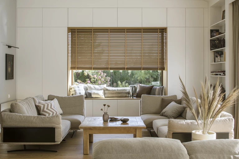 Do największych zmian, jakie dokonały się w remontowanym domu, należało wykucie w ścianie salonu dodatkowego wielkoformatowego okna z widokiem na ogród. Słowo „okno” nie wyczerpuje jednak tematu. Dookoła nowego otworu Malwina Morelewska zaprojektowała pojemną i funkcjonalną zabudowę. Poniżej szyby pojawiło się zapraszające do relaksu siedzisko. Z kolei nad nią – kaseta, w której w całości chowa się zsunięta żaluzja, która dzięki temu nie przesłania krajobrazu i nie zatrzymuje światła. A sam pejzaż ujęty został w dębową ramę.