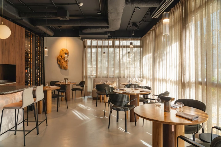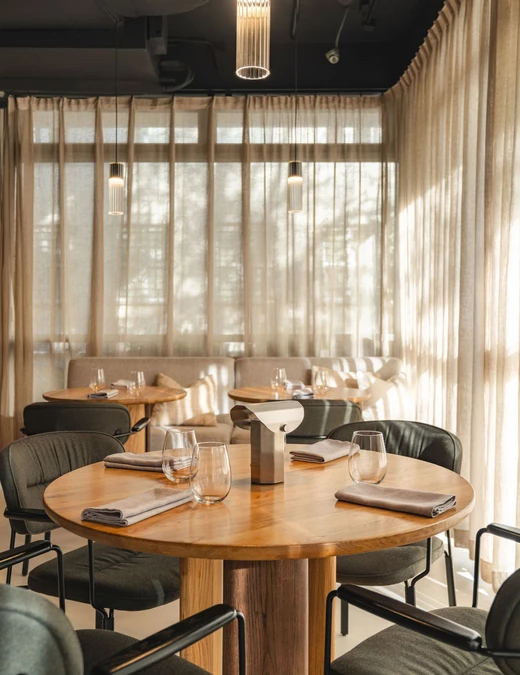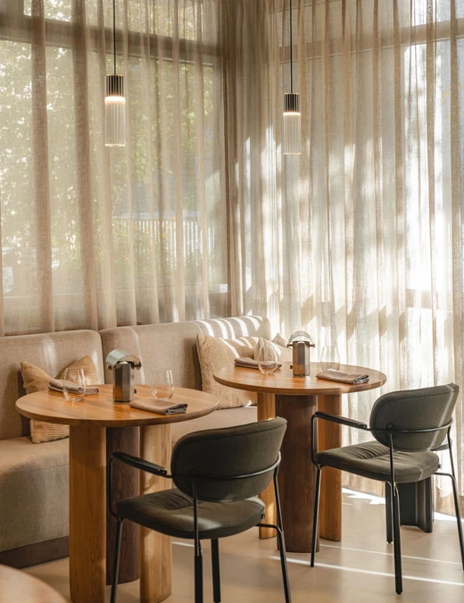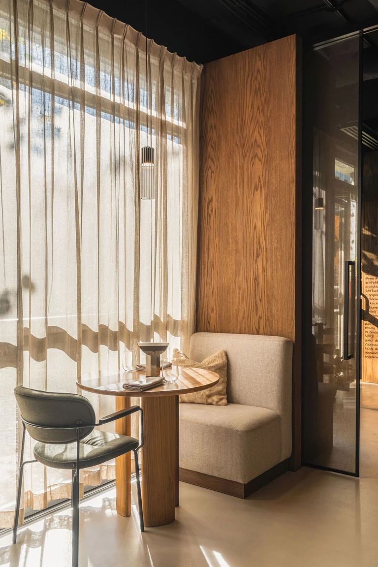 Kolorystykę wnętrza utrzymano w tonacjach ziemi, tworząc spokojne tło dla serwowanych dań.