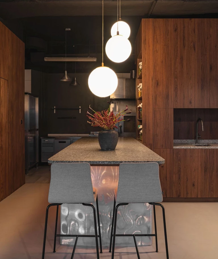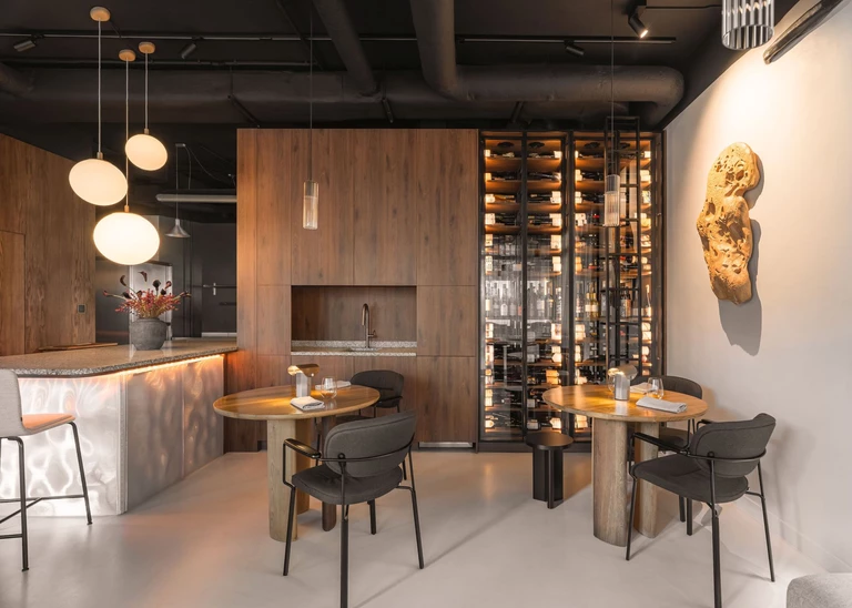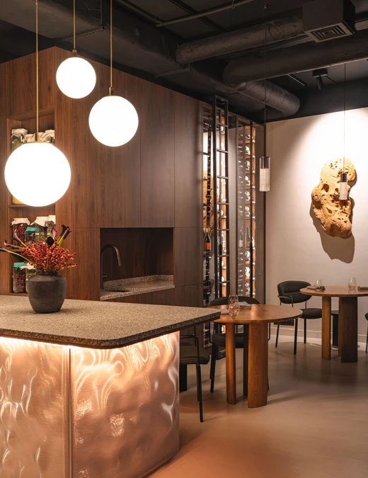 Centralnym punktem restauracji jest wyspa kucharska z miejscami typu „chef’s table”, która umożliwia gościom obserwowanie pracy w kuchni.