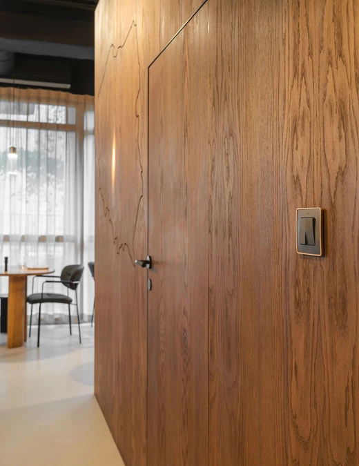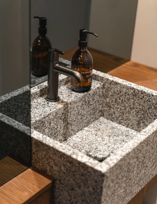Wnętrze celowo unika ostentacyjnego luksusu, stawiając na spokojną, dyskretną elegancję. Zastosowane materiały – płomieniowany, matowy granit strzegomski, dębowy fornir, szkło i stal – tworzą spójną paletę. Chropowatość kamienia kontrastuje z gładkością drewna.