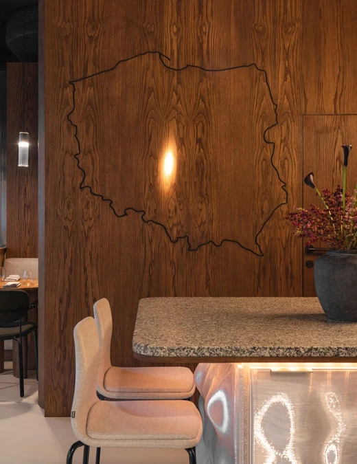 Ważnym elementem narracyjnym wnętrza również mapa Polski wycięta w fornirze, subtelnie podświetlana tak, aby wskazywać region pochodzenia aktualnego menu. Na jeden ze ścian zawisł także obraz Magdaleny Król.