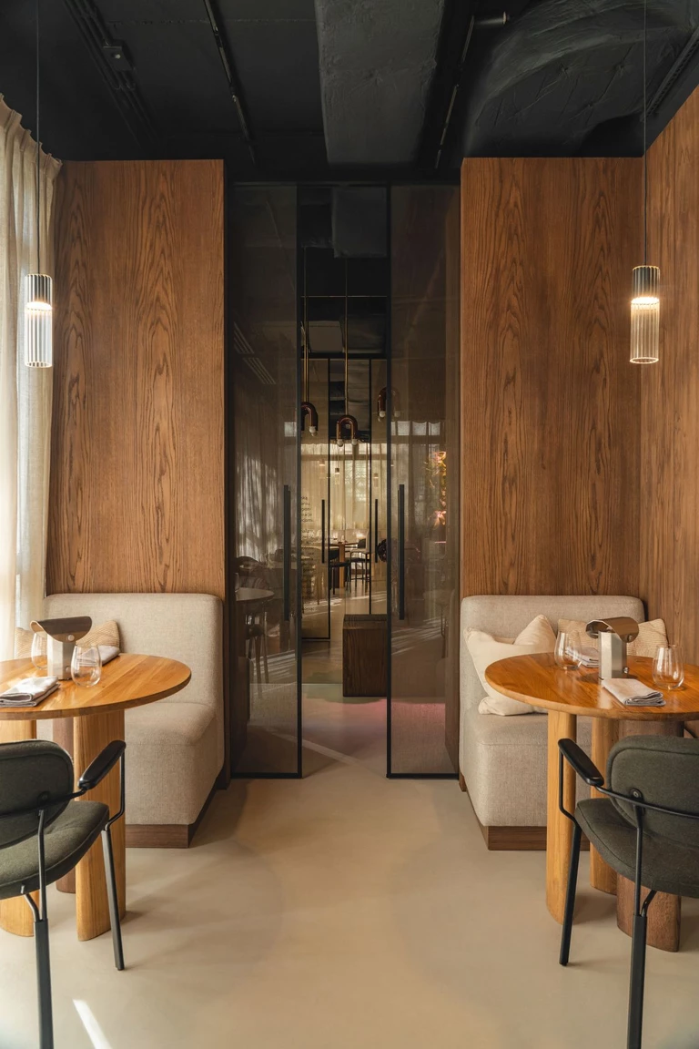 Już od wejścia uwagę zwraca szklana przegroda z wtopionym lnem, oddzielająca restaurację od ulicznego zgiełku i budująca bardziej intymną atmosferę.