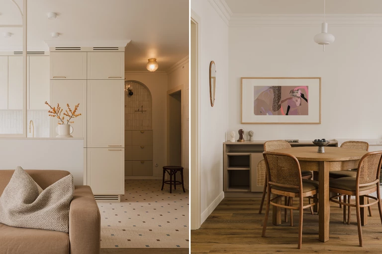 Ducha dawnej kamienicy tworzą w tym wnętrzu stare dodatki wplecione w nowy wystrój – lustro łazienkowe zostało znalezione w antykwariacie, w salonie i sypialniach są zaś oryginalne, stare grzejniki w salonie i sypialniach, które odnowiono i pomalowano na kolor szarego brązu. Udało się też odtworzyć oryginalną stolarkę drzwiową. Architektka stosuje też motywy nawiązujące do wnętrze retro, takie jak płytki gorseciki na podłodze, klasyczne modele mebli czy plecionkę wiedeńską.