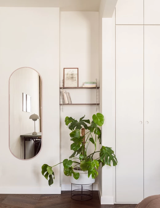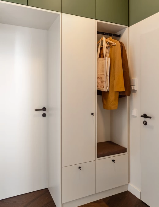 Aby jak najlepiej wykorzystać przestrzeń w małym wejściu, projektantka stworzyła na zamówienie szafę, która okala drzwi do łazienki, dzięki czemu zyskano miejsce do przechowywania.
