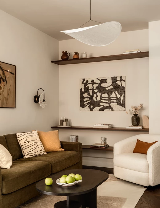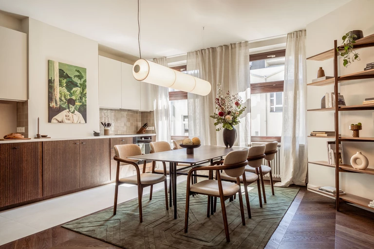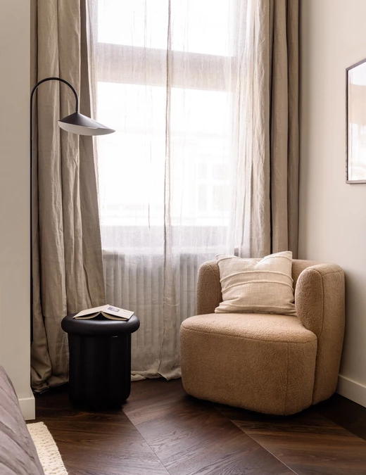Baza aranżacji wnętrza została zbudowana na neutralnej palecie barw, dlatego projektantka zdecydowała się na naturalne materiały, takie jak len czy dąb. Dominują brązy, beże, ciemna zieleń i biel. Meble utrzymane zaś w stylistyce „cichej elegancji” - to ponadczasowe, klasyczne w formie propozycje głównie od skandynawskich marek.