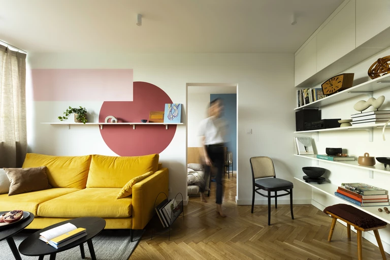 Centralnym punktem wnętrza jest ściana z kanapą wykończoną musztardowo-żółtym welurem, nad którą znajduje się kompozycja geometryczna z dużym okręgiem. Wyraziste kolory, pojawiające się w postaci barwnych plam na ścianach oraz na płytkach ze wzorem terazzo, współgrają z wszechobecną w mieszkaniu bielą i jasnym, ciepłym drewnem oraz przełamują retro klimat mid-century modern, nadając wnętrzu współczesny charakter.