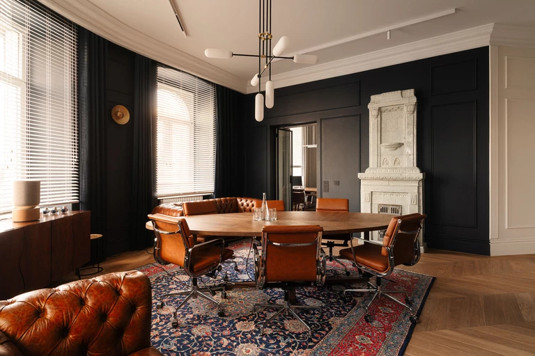 Motyw stalowo-szklanych przegród w czarnych ramach prowadzi użytkownika przez kolejne pomieszczenia. Centralnym punktem układu jest narożna sala konferencyjna – wypełniona światłem, utrzymana w głębokim kolorze atramentu. W środku pomieszczenia stoi owalny stół z ciemnego dębu, otoczony krzesłami i sofami vintage typu Chesterfield z karmelowej skóry.