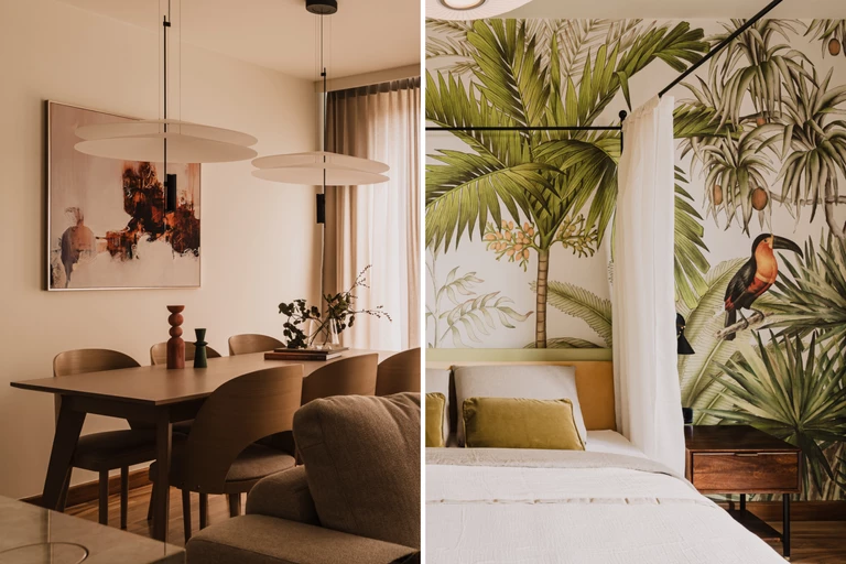 „Miejska dżungla" to określenie stosowane w kontekście współczesnych miast, które często charakteryzują się gęstą zabudową, hałasem, szybkim tempem życia i tłumem. Projektantki z Lessness Studio, aranżując wnętrze tego krakowskiego mieszkania, podeszły do powyższego sformułowania w bardziej dosłowny sposób. Wykreowały harmonijną przestrzeń, wypełnioną naturalnymi materiałami, w której główne skrzypce gra tapeta z motywem dżungli.