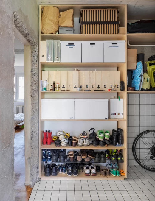 Głównym bohaterem tego mieszkania oprócz betonu została sklejka. Wykonano z niej pojemne regały, półki, a nawet meble kuchenne. Przedpokój i kuchnię połączono wizualnie prostymi płytkami.