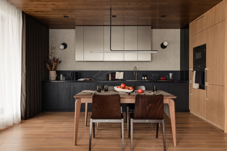 Pierwsze skrzypce w strefie dziennej miała grać kuchnia, miejsce idealne do eksperymentów kulinarnych. Prowadzi do niej, od samego wejścia, drewniany „szlak” na suficie. Jest on niewątpliwie najbardziej charakterystycznym elementem całego wnętrza. Piękny, wyrazisty sufit wykończony ciemnymi dębowymi deskami, wprowadza klimat góralskiej, a jednak nowoczesnej chaty. Przewrotne zastosowanie paneli podłogowych na innej płaszczyźnie i wyjście poza schemat dało niesamowity efekt.