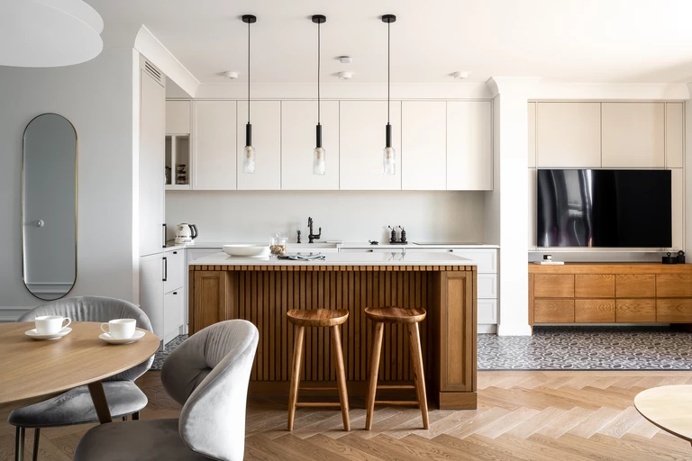Projekt rozpoczęto od starannego uporządkowania układu funkcjonalnego. Podzielono mieszkanie na część dzienną oraz prywatną, aby każda ze stref miała własną, wyraźną tożsamość. Centralnym punktem części dziennej jest salon połączony z kuchnią, gdzie kluczową rolę pełni wyspa – harmonijnie łącząca kuchnię z jadalnią i niewielkim holem wyposażonym w siedzisko i wieszaki. Zaprojektowano również przestronną łazienkę z dużym prysznicem oraz praktyczne pomieszczenie pełniące funkcję pralni z dodatkową toaletą.