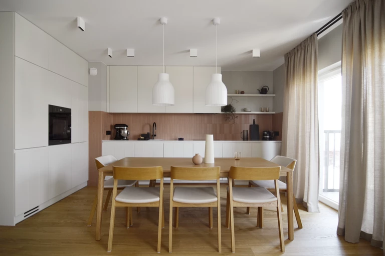 Najważniejsza dla właścicieli była przestrzeń, w której cała rodzina mogłaby wspólnie spędzać czas. Tę funkcję pełni dziś salon z aneksem kuchennym i jadalnią, który powstał z połączenia ze sobą dwóch pokoi. Jego centrum to dębowy stół, przy którym odrabia się lekcje, zasiada do posiłków czy po prostu rozmawia.