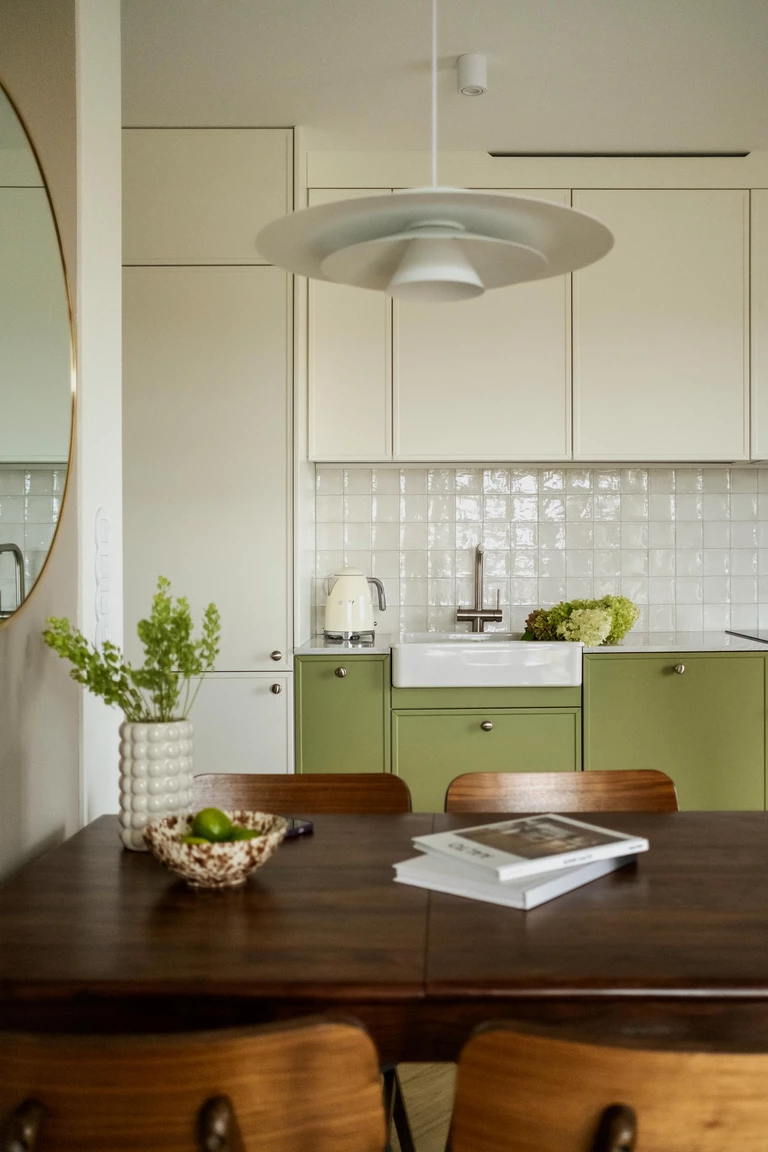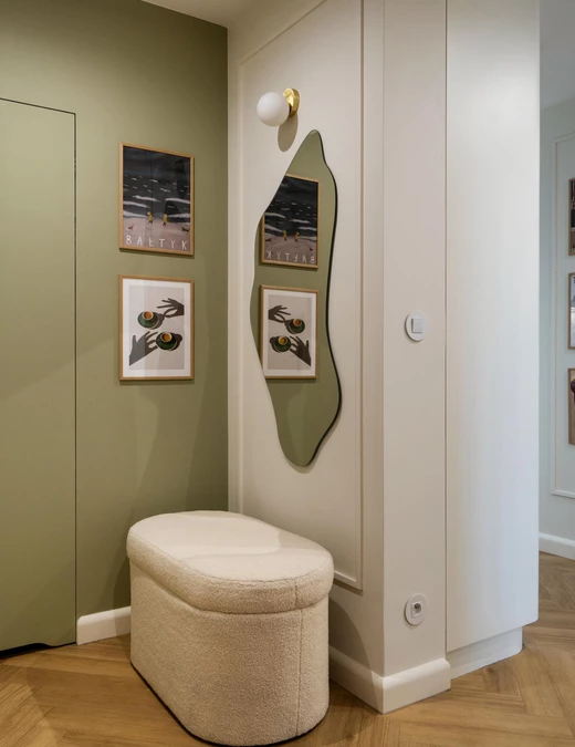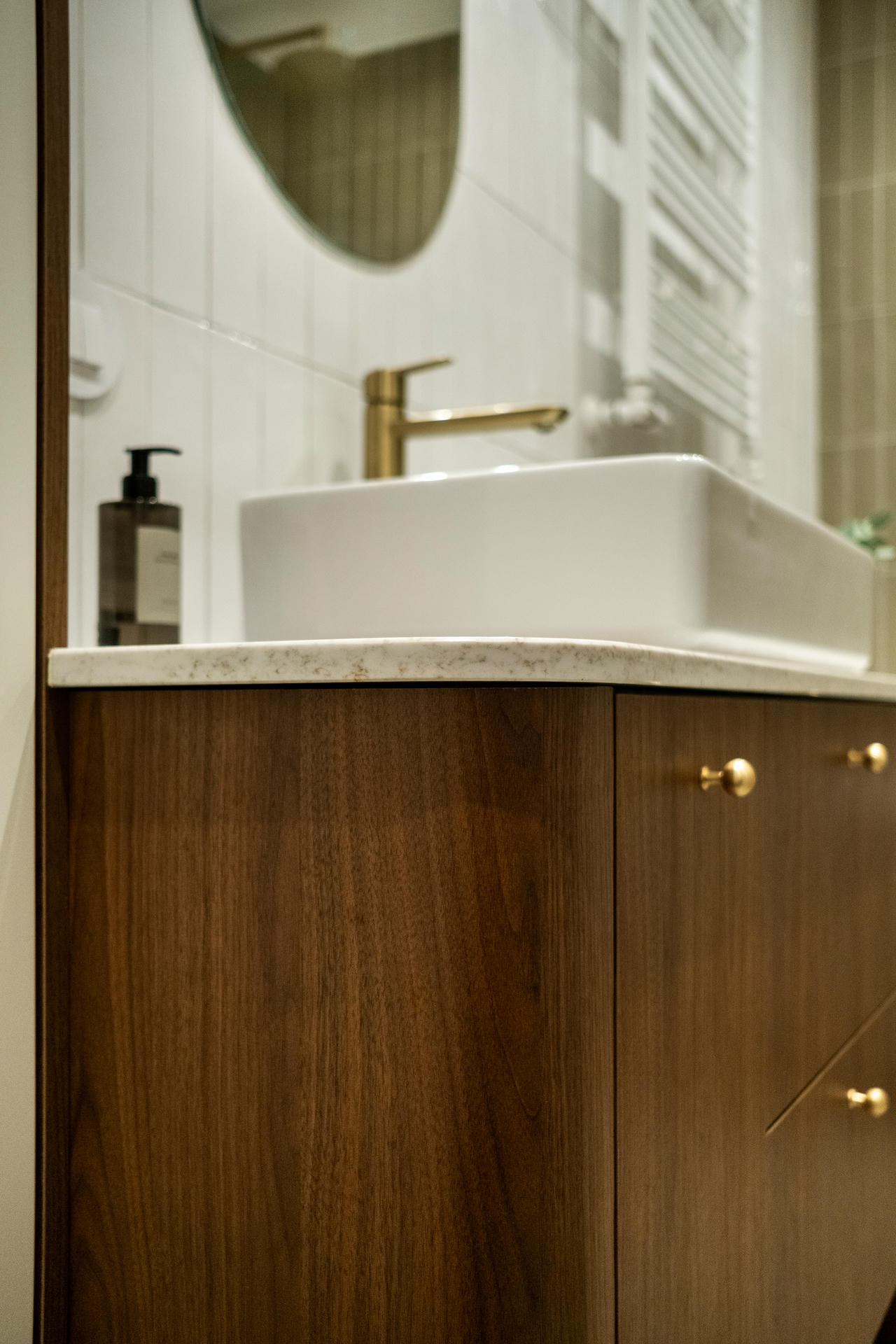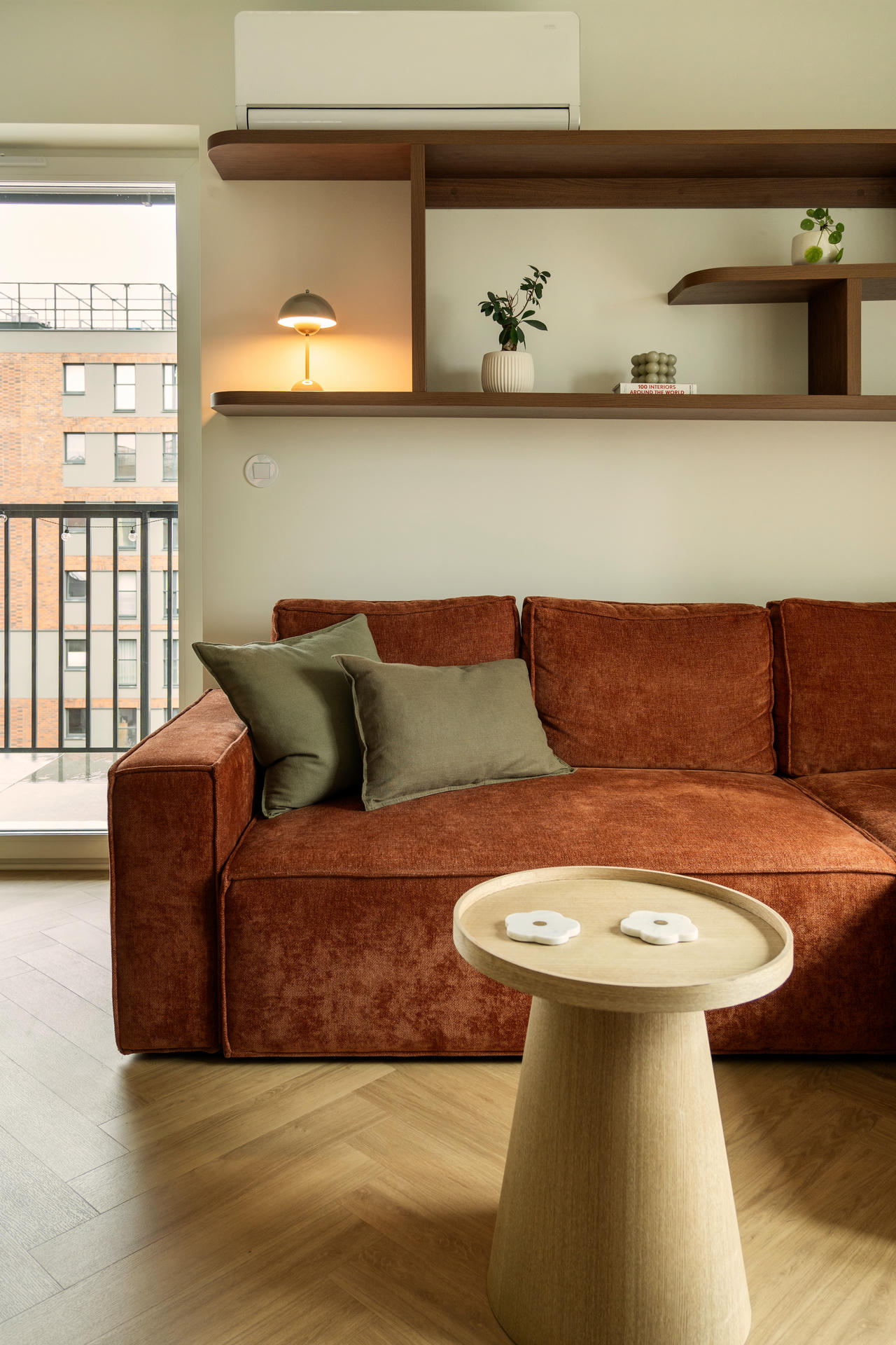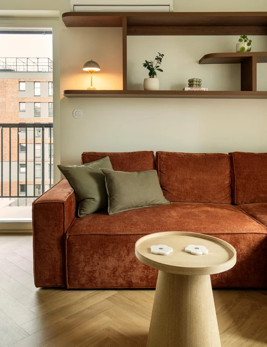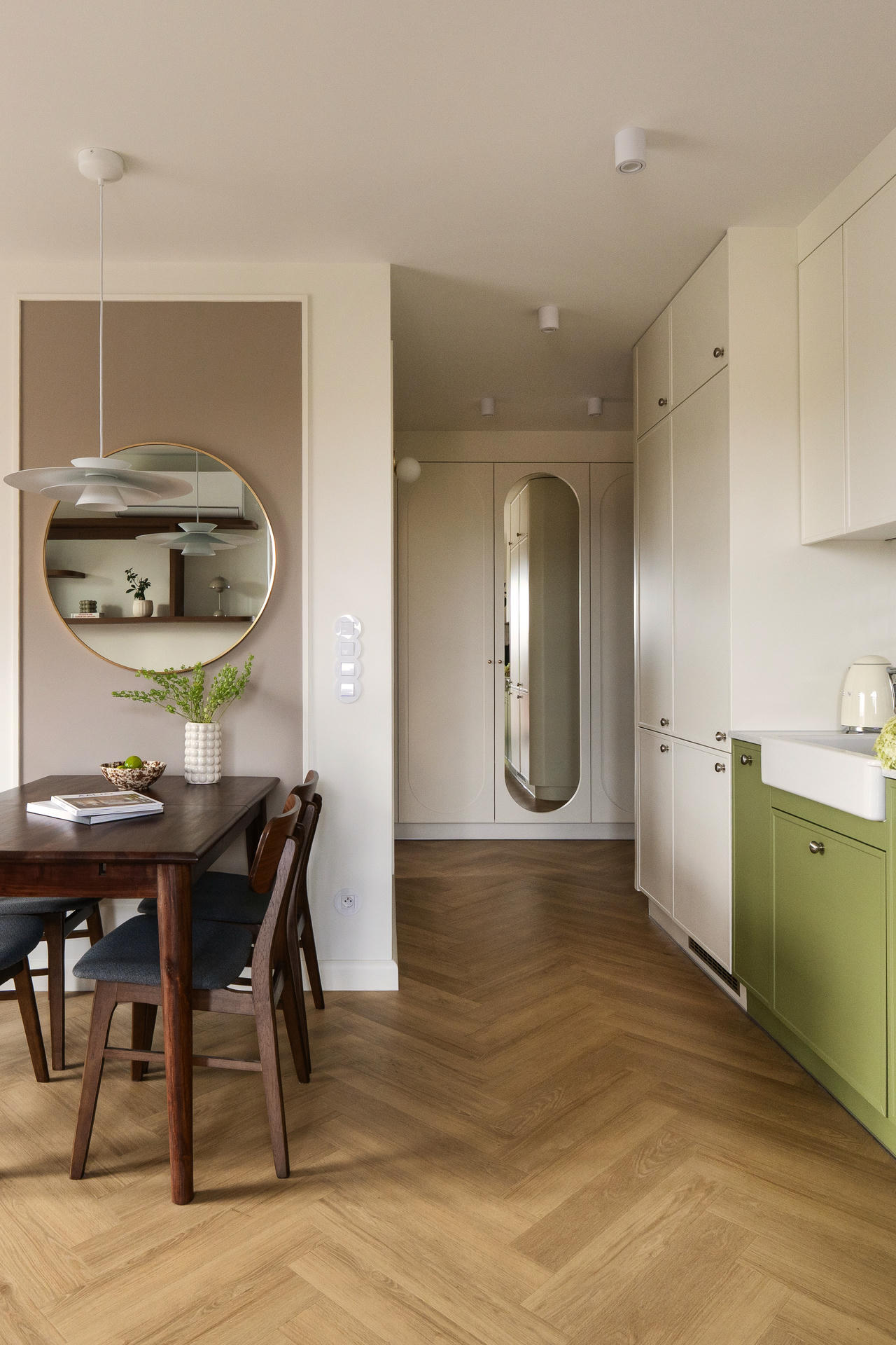 Choć mieszkanie znajduje się w ścisłym centrum, jego atmosfera daleka jest od miejskiego zgiełku. Postawiono na ciepłe barwy, naturalne odcienie i materiały, które przywodzą na myśl wnętrza inspirowane japońskim minimalizmem i vintage’owym ciepłem. Pojawiają się też ciemne drewno, zaoblenia mebli i okrągłe uchwyty–gałki, a także delikatne formy opraw oświetleniowych.