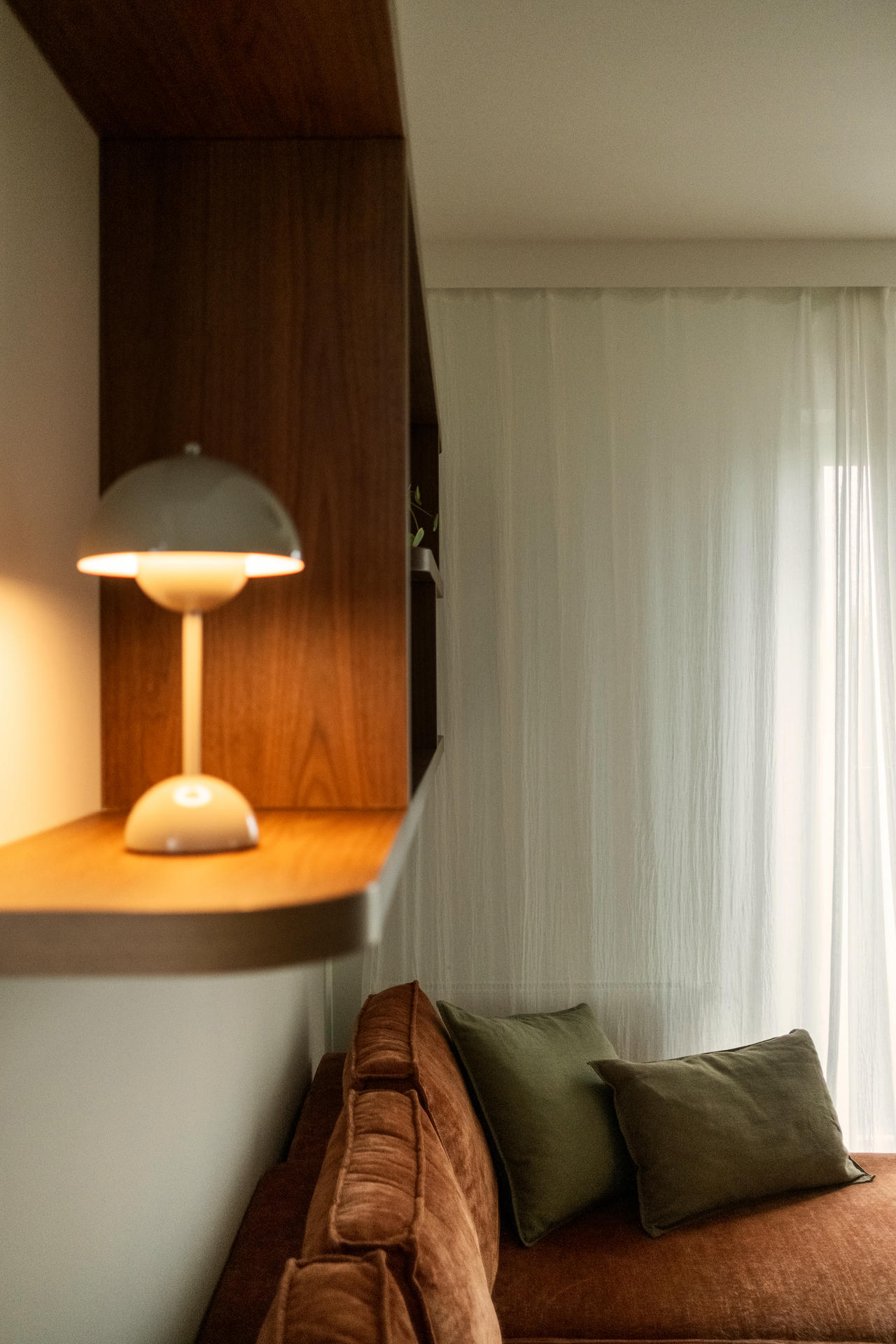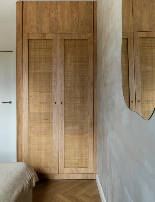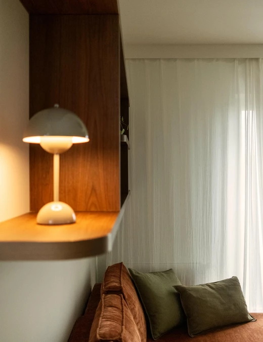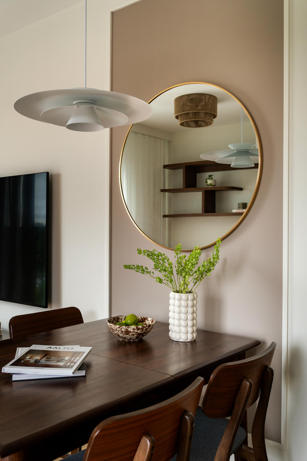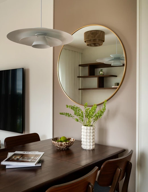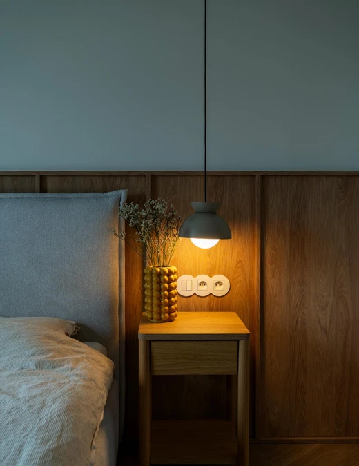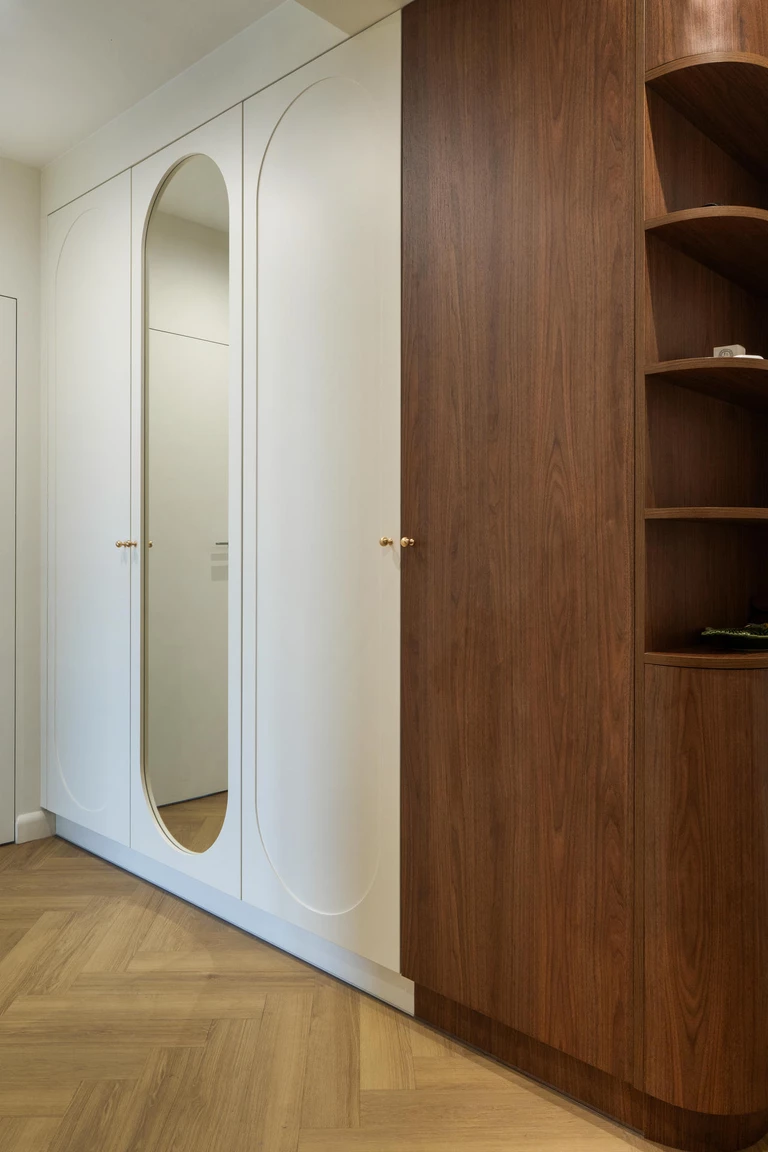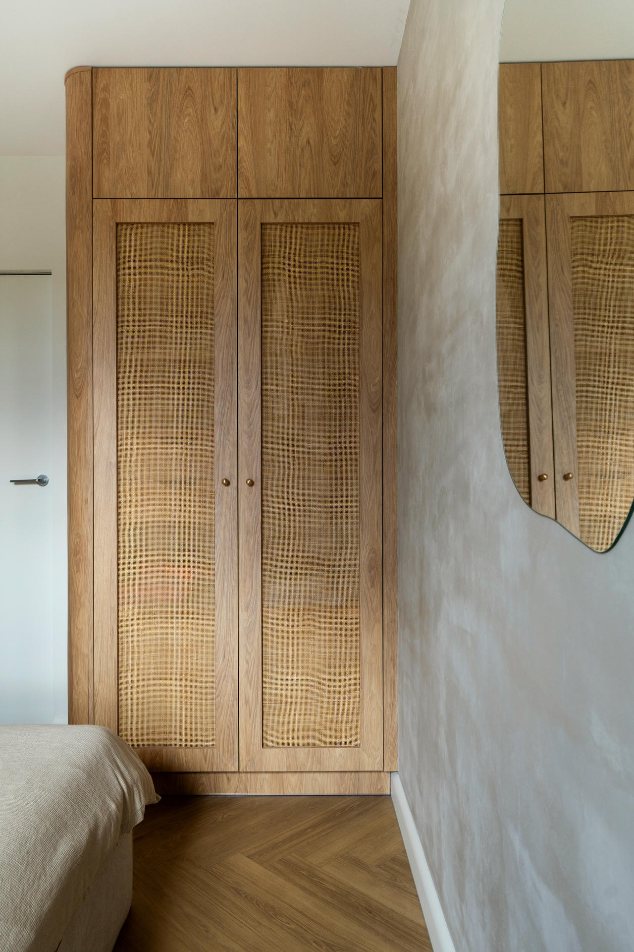 Choć mieszkanie znajduje się w ścisłym centrum, jego atmosfera daleka jest od miejskiego zgiełku. Postawiono na ciepłe barwy, naturalne odcienie i materiały, które przywodzą na myśl wnętrza inspirowane japońskim minimalizmem i vintage’owym ciepłem. Pojawiają się też ciemne drewno, zaoblenia mebli i okrągłe uchwyty–gałki, a także delikatne formy opraw oświetleniowych.