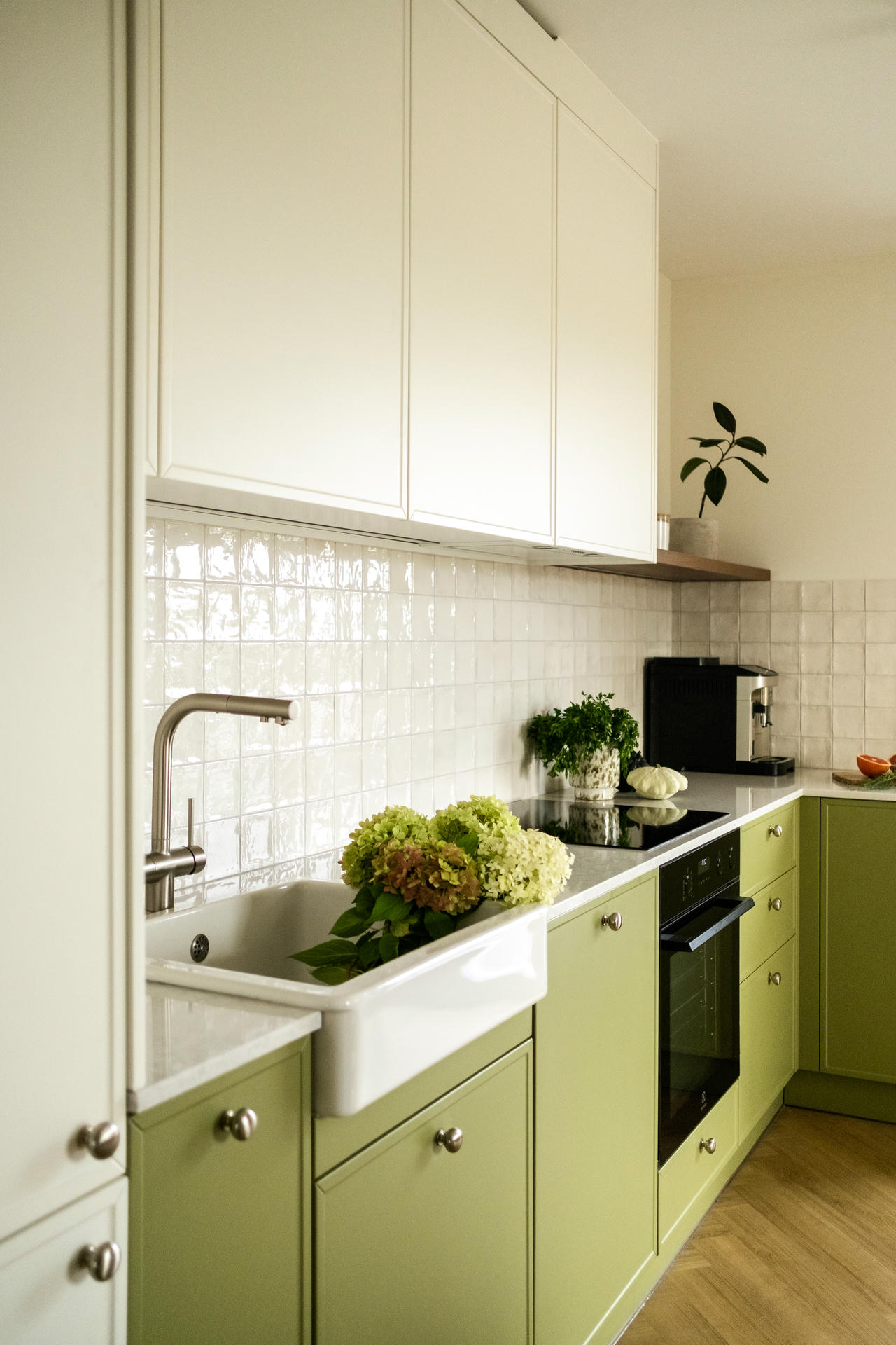 W kuchni – na stosunkowo niewielkiej powierzchni – zaprojektowano dużą ilość blatu roboczego i przestrzeni do przechowywania. Dzięki wysokiej zabudowie z charakterystycznym zaobleniem (motywem przewijającym się przez cały projekt) przestrzeń płynnie przechodzi z korytarza do części dziennej – kuchennej, jadalnianej i salonowej.