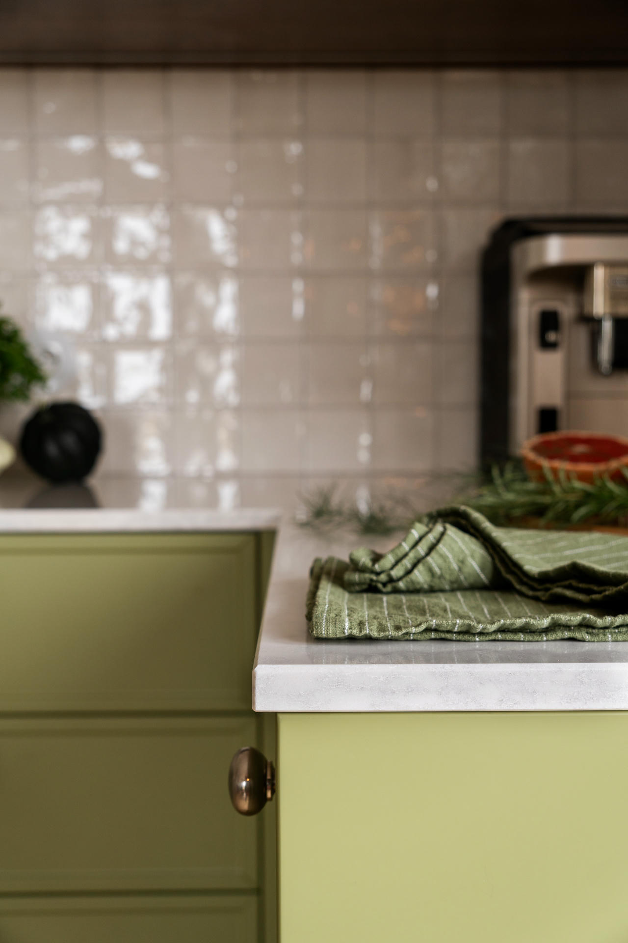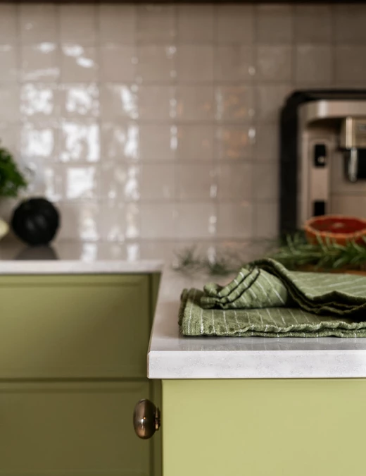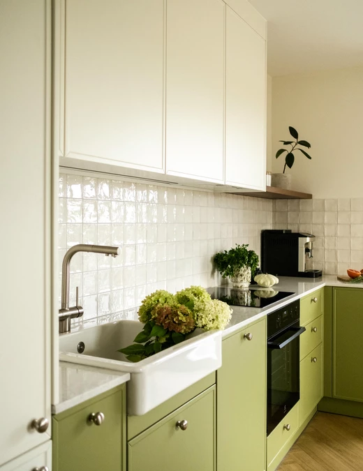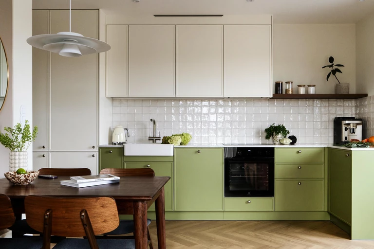 Projektantka zestawiła ciepłe biele z ceglaną sofą, która pięknie łapie światło zachodzącego słońca, oraz z oliwkową zielenią szafek kuchennych, wprowadzającą naturalny, wyrazisty akcent.