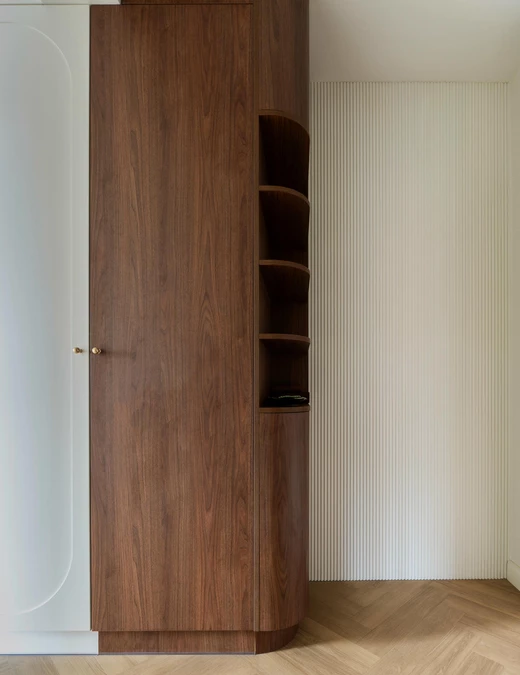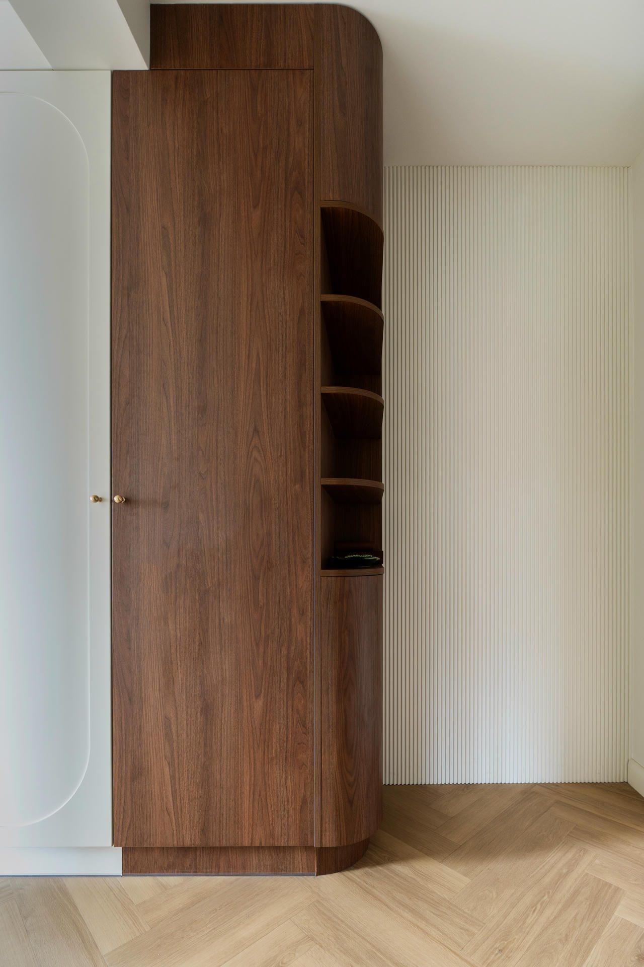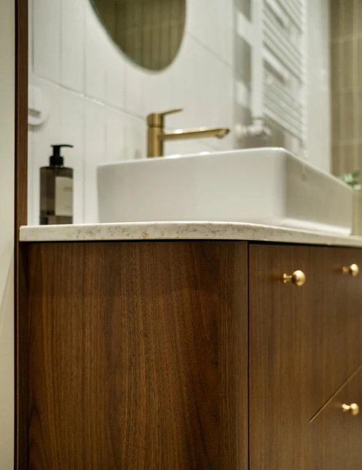 Zastosowano naturalne drewno oraz najwyższej klasy laminaty drewnopodobne od Woodeco i Egger – zwłaszcza w miejscach, gdzie potrzebna była trwałość i precyzyjne wykończenie zaobleń (np. w korytarzu i sypialni).