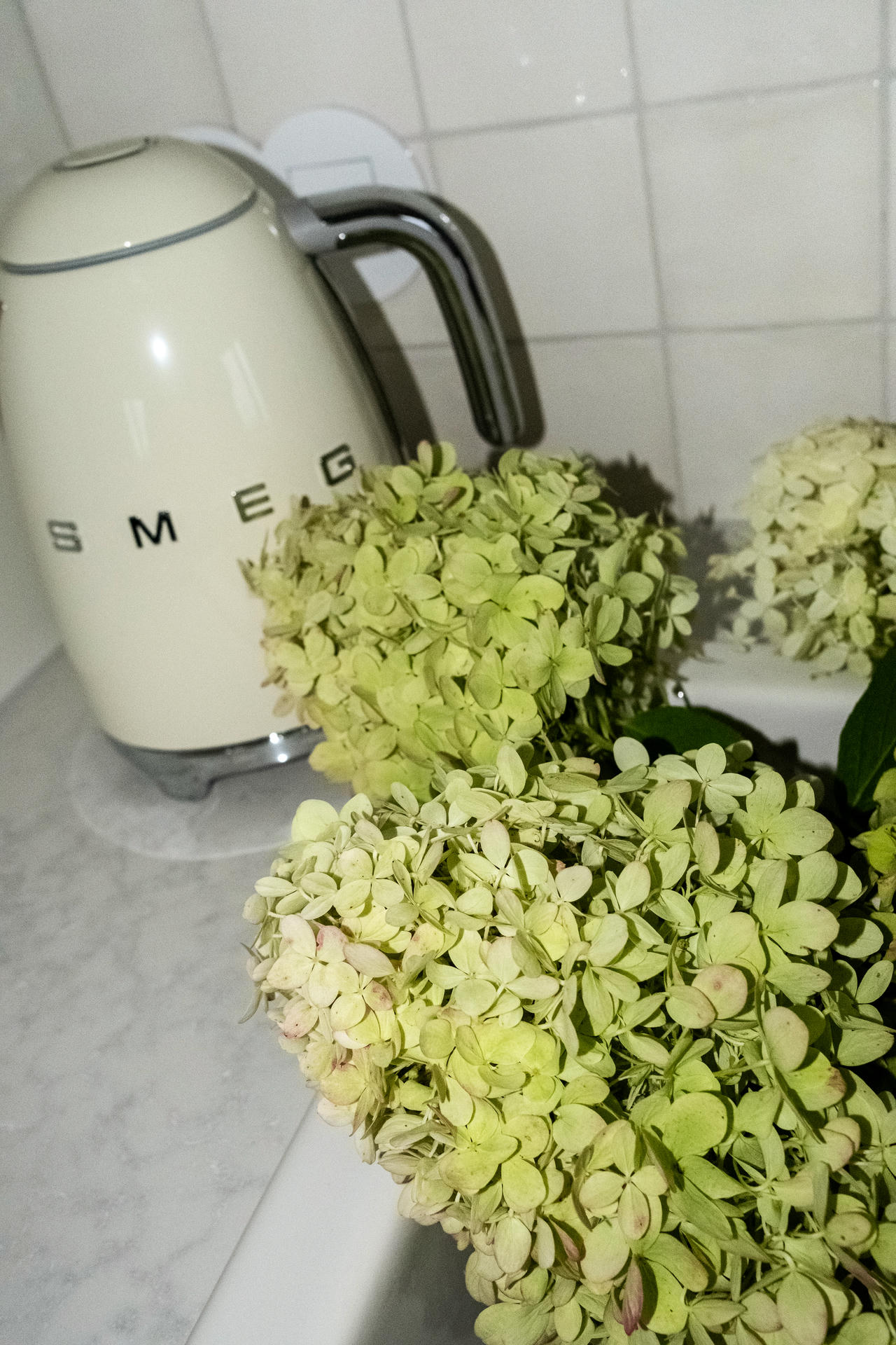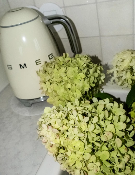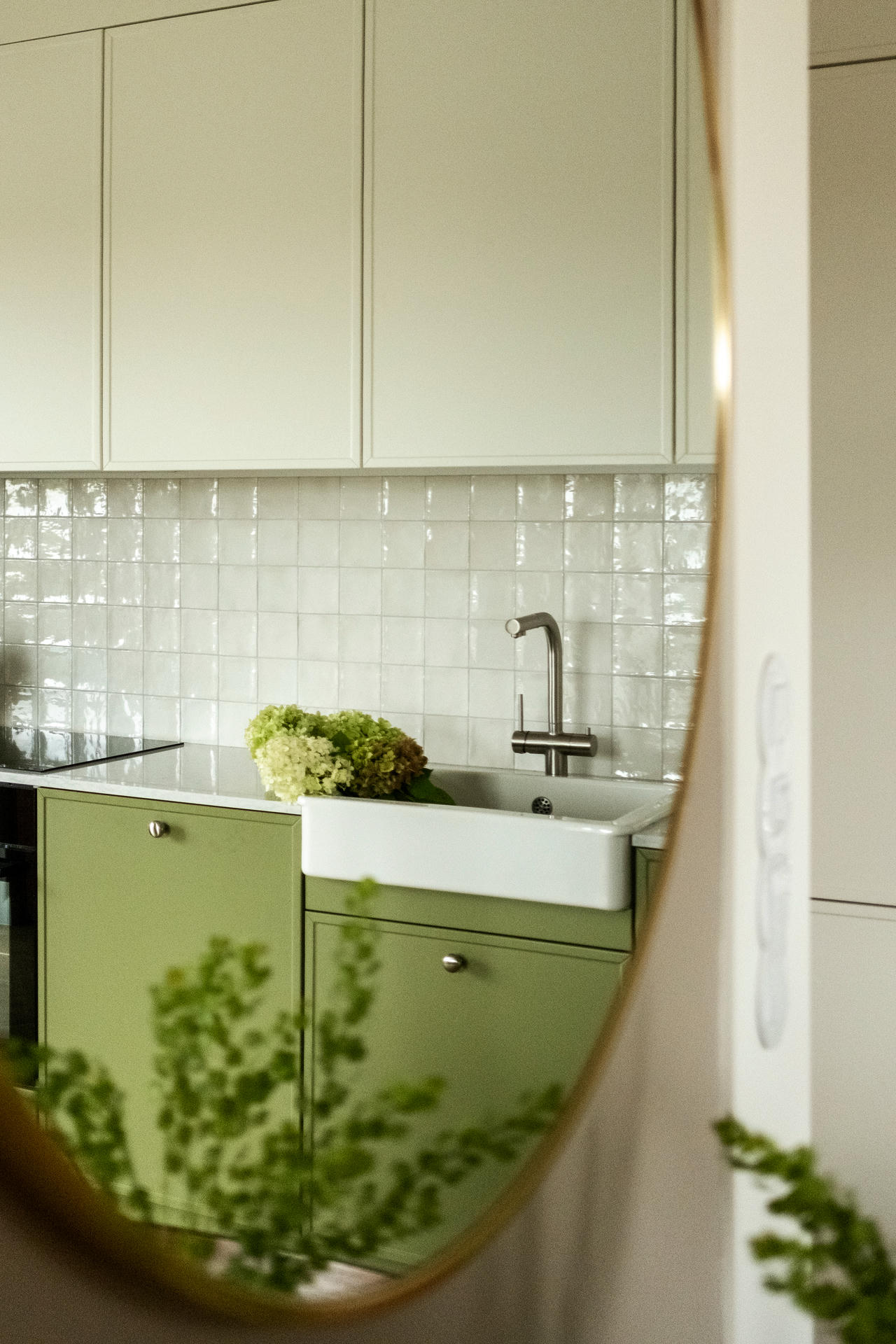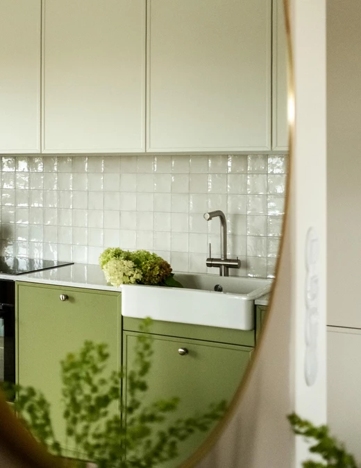 Łóżko pochodzi z IWC Home, dodatki – jak ceramiczna miska z DOM Store – podkreślają naturalny, subtelny charakter wnętrza. W kuchni zastosowano płytki cegiełki i kwadratowe od Equipe, które pięknie dopełniają całość aranżacji.