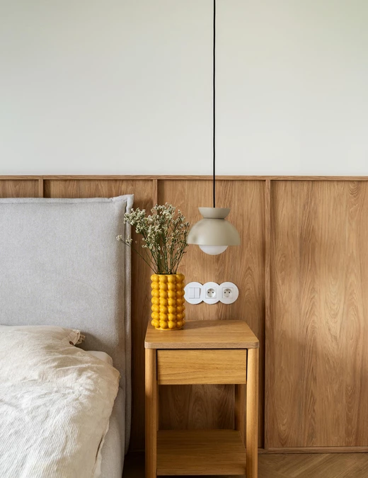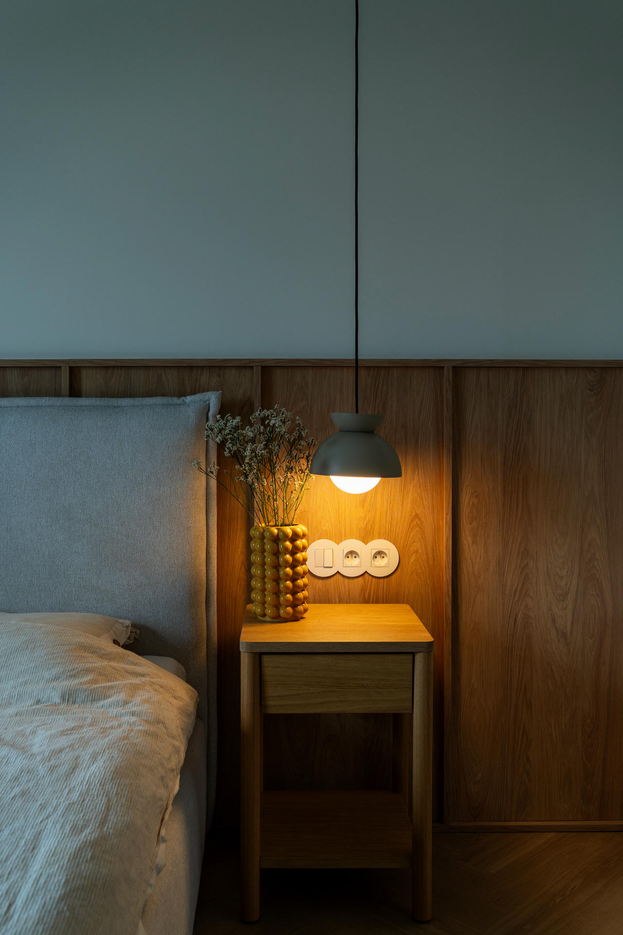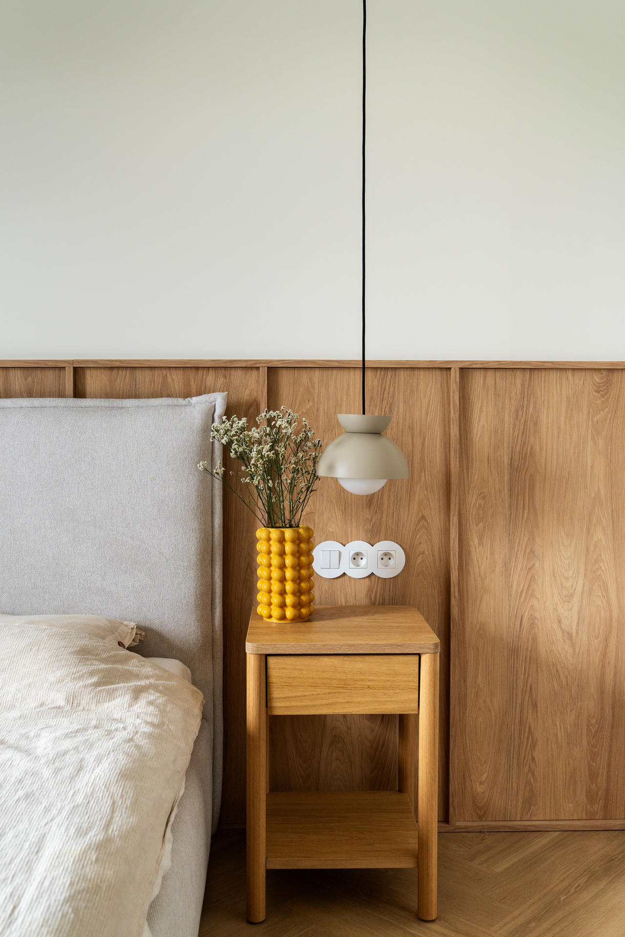 W sypialni, mimo jej niewielkich rozmiarów, udało się zaplanować pełnowymiarową szafę. Ściana pokryta została farbą dekoracyjną w naturalnym kolorze, a za łóżkiem znalazł się drewniany panel, który dodatkowo ociepla przestrzeń.