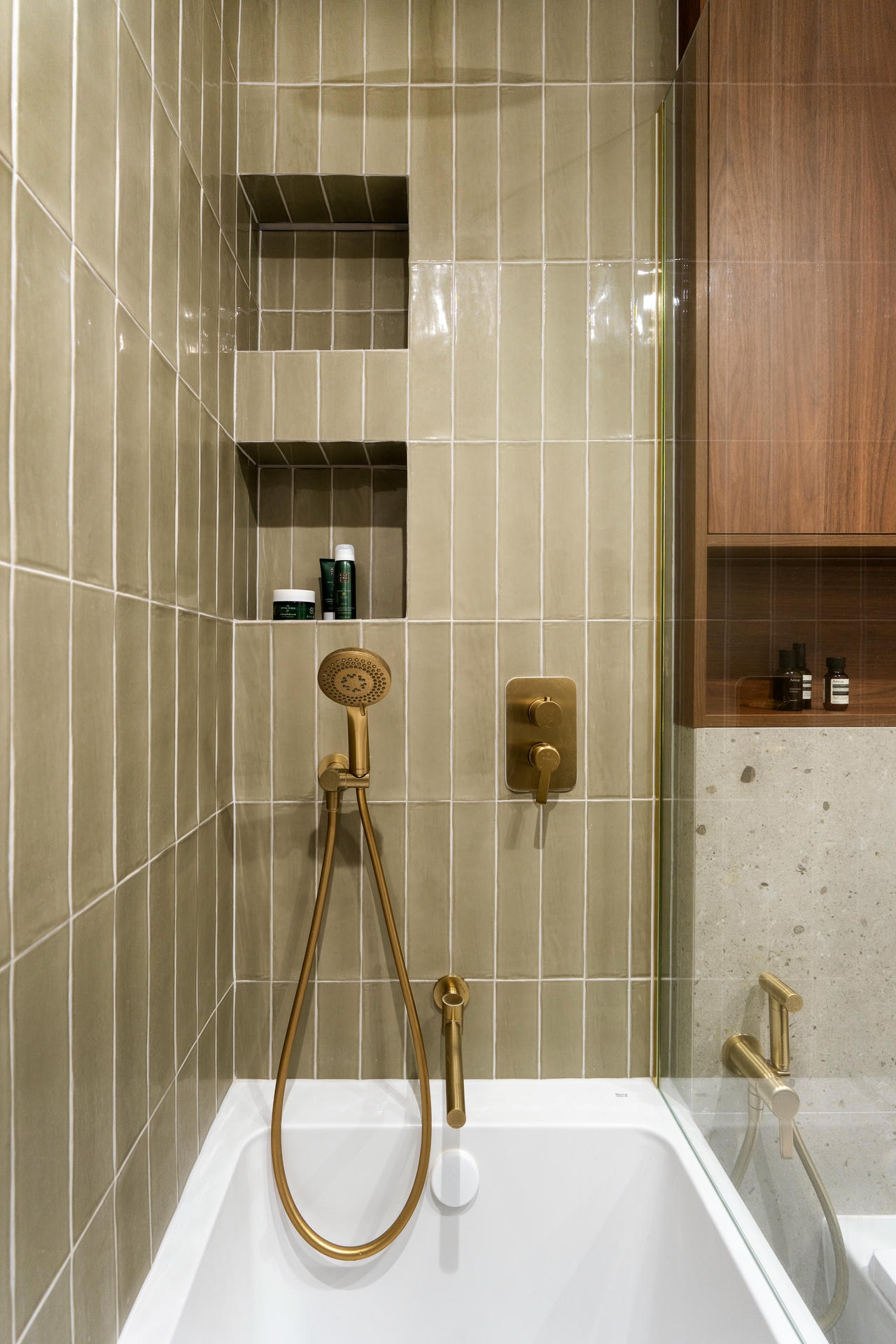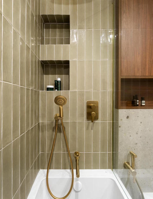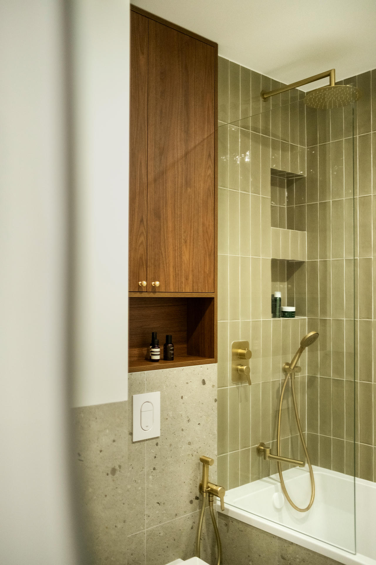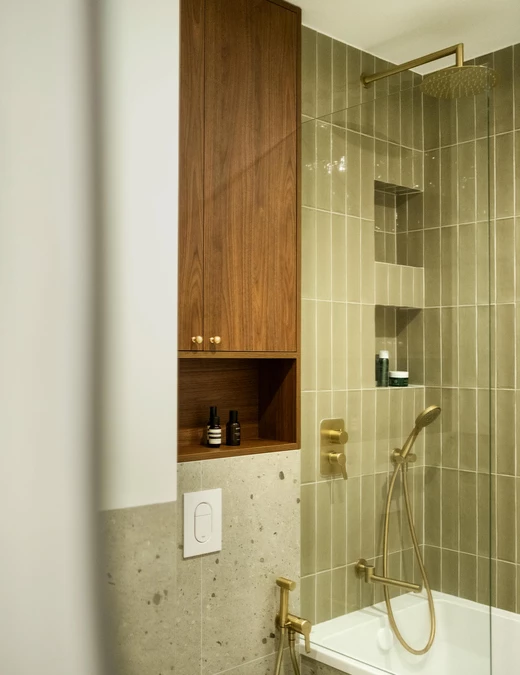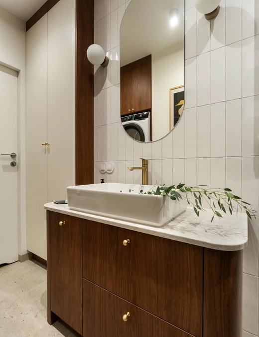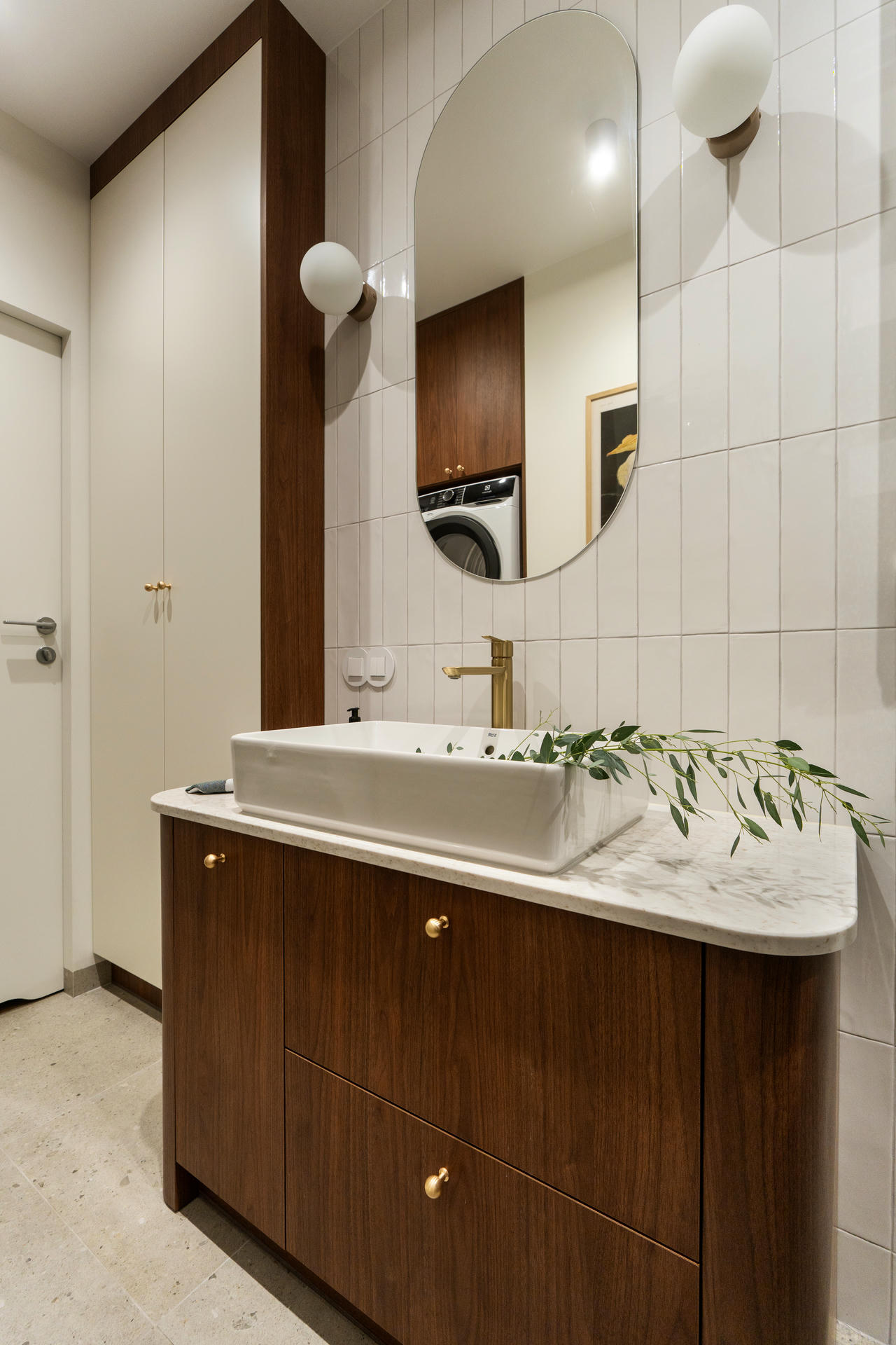 Największym wyzwaniem była łazienka – ponadprzeciętnie długa i wąska jak na nowe budownictwo, a konieczne było zmieścić w niej słupek z pralką i suszarką, miejsce na przechowywanie ręczników, chemii, kosmetyków – i to nam się bardzo udało – zaznacza projektantka z Flat Studio. Dzięki sprytnym rozwiązaniom i zastosowaniu zaobleń udało się „złagodzić” przestrzeń, czyniąc ją bardziej komfortową i funkcjonalną.