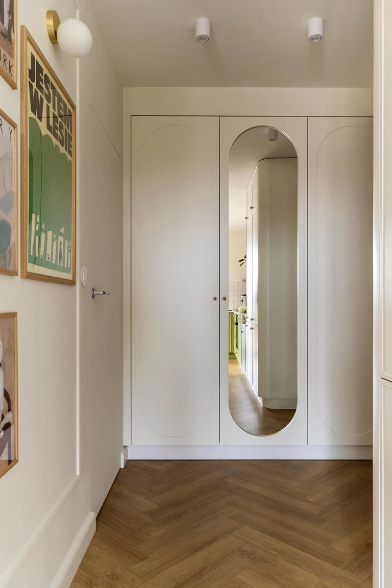 Jednym z głównych założeń projektu było maksymalne wykorzystanie przestrzeni i zapewnienie dużej ilości miejsca do przechowywania. W korytarzu powstała pojemna zabudowa w dopracowanej, estetycznej formie.