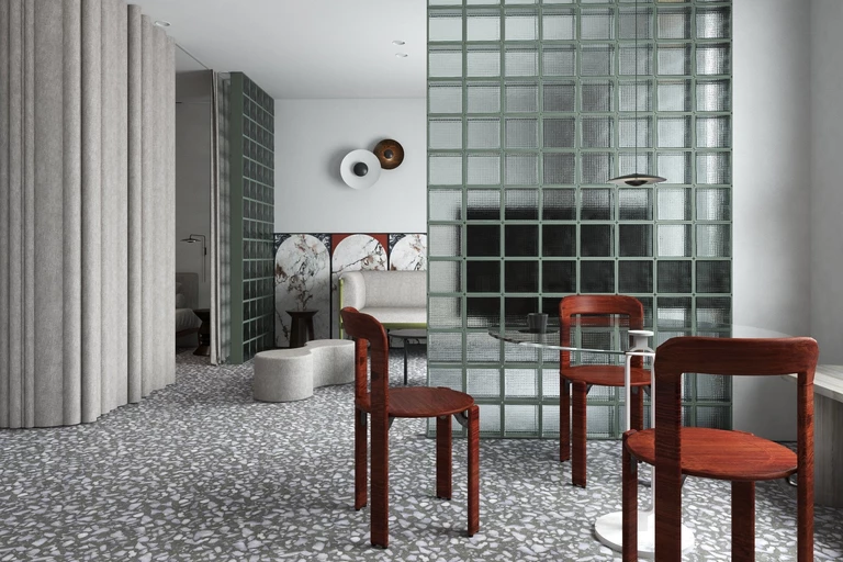 Surowo wydzielony podział funkcjonalny nie przekłada się jednak na stylistyczną warstwę projektu. Dzięki zastosowaniu w każdej części mieszkania tych samych wyrazistych materiałów wykończeniowych wnętrze postrzega się jako spójną integralną całość. Geometryczne formy, kolorowe akcenty i szlachetne forniry zestawiono z jednolitą, szarą posadzką terazzo, która daje poczucie niewymuszonej, figlarnej elegancji.