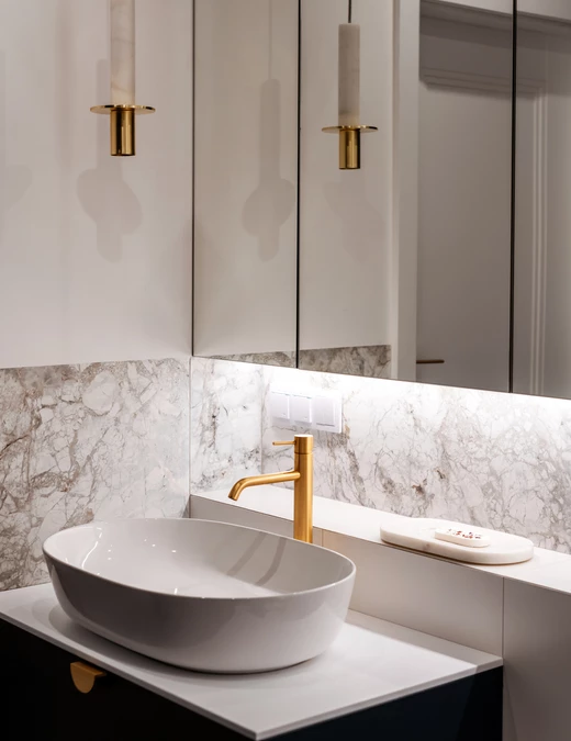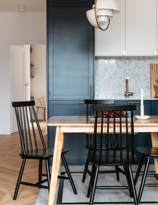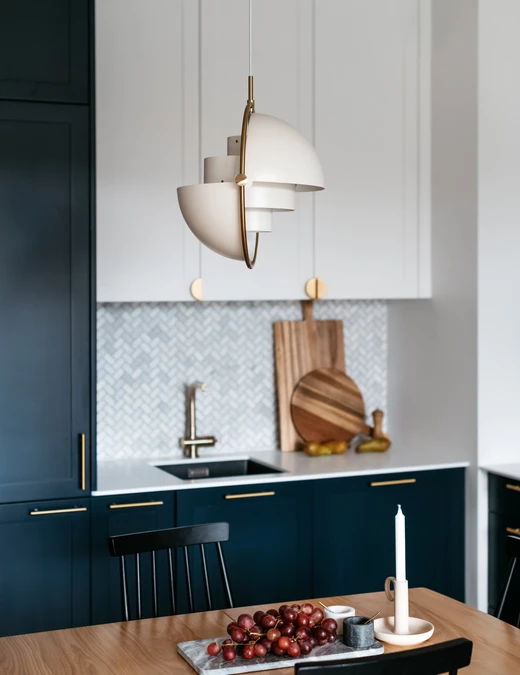 „Postawiłyśmy na granat, który płynnie łączy ze sobą wszystkie pomieszczenia. Występuje na zabudowach w kuchni, łazience, toaletce w sypialni, a także na narożniku w salonie. Do granatu dobrałyśmy eleganckie mosiężne uchwyty, dębową, bieloną jodełkę francuską oraz elementy marmurowe” – mówią projektantki. Całość zdobi wisząca nad stołem piękna lampa marki Gubi.