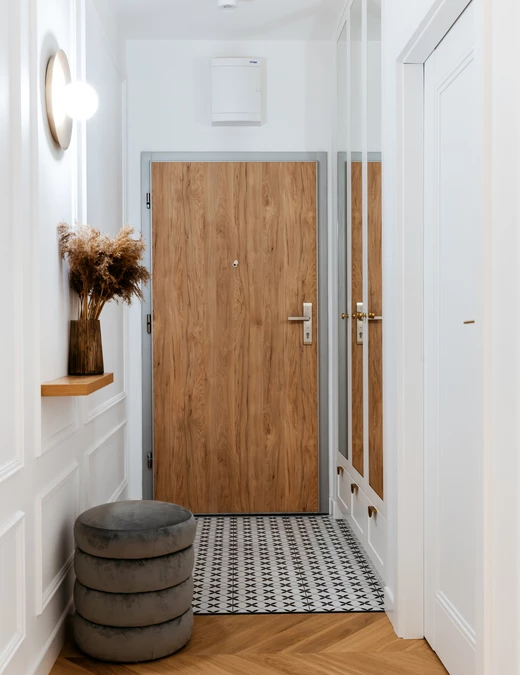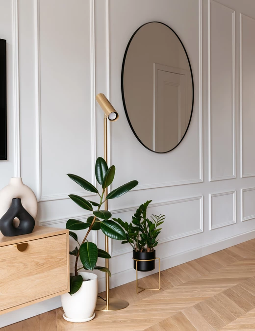 Na ścianach w holu oraz w części dziennej znalazły się delikatne, nowoczesne sztukaterie, w obrębie których wkomponowano duże, okrągłe lustro, TV oraz mosiężny kinkiet w przedpokoju.