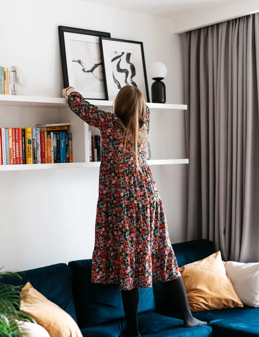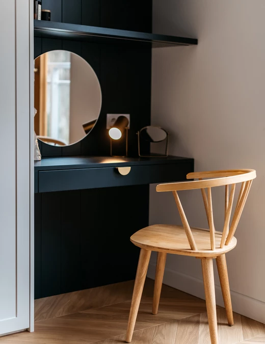 Projektantki zadbały o to, aby w przestrzeni wygospodarować jak najwięcej miejsca do przechowywania. Łazienkę połączono z toaletą, dzięki czemu pojawiło się miejsce na szafę, w której sprytnie ukryto pralkę i suszarkę. Nad sofą pojawiły się półki na książki zajmujące całą długość ściany. W sypialni z kolei wygospodarowano toaletkę, która pełni również funkcję małego biurka.