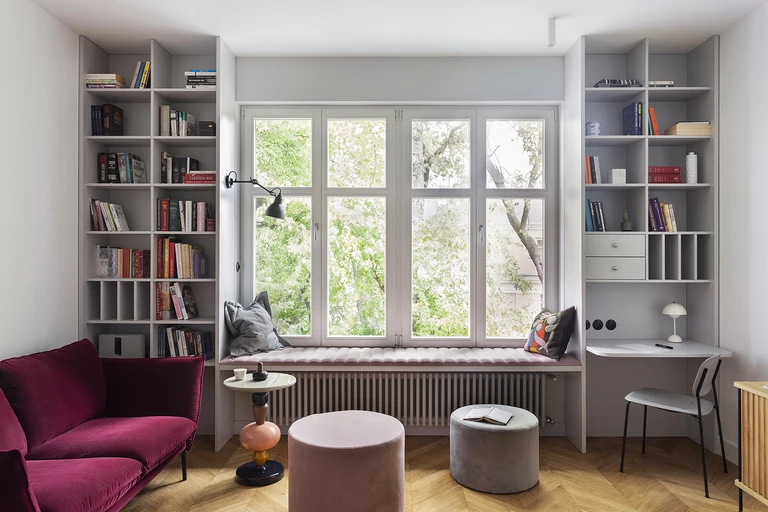 W byłej sypialni znalazło się miejsce na wygodną kuchnię, jadalnię, kącik do pracy i miejsce wypoczynku z super bonusem w postaci dużego okna z niskim parapetem. To wokół okna skupiła się cała koncepcja wnętrza. Zabudowanie okna i ujęcie go w ramy regału z obowiązkowym siedziskiem – to była pierwsza oczywista sprawa, która wynikała z zastanych warunków. Dziś to miejsce zaprasza, by usiąść tam z kubkiem kawy i książką lub zwyczajnie zapatrzeć się w zieleń za oknem.